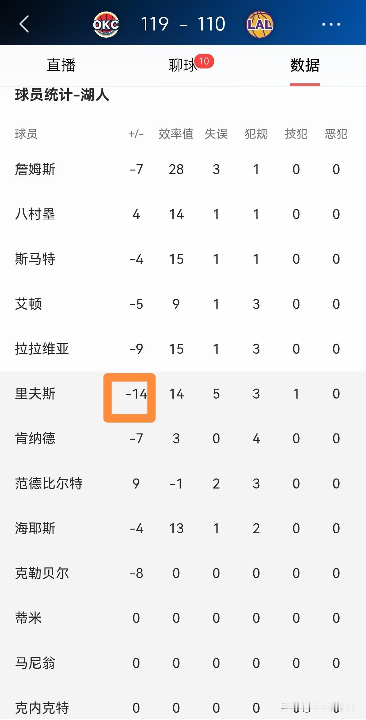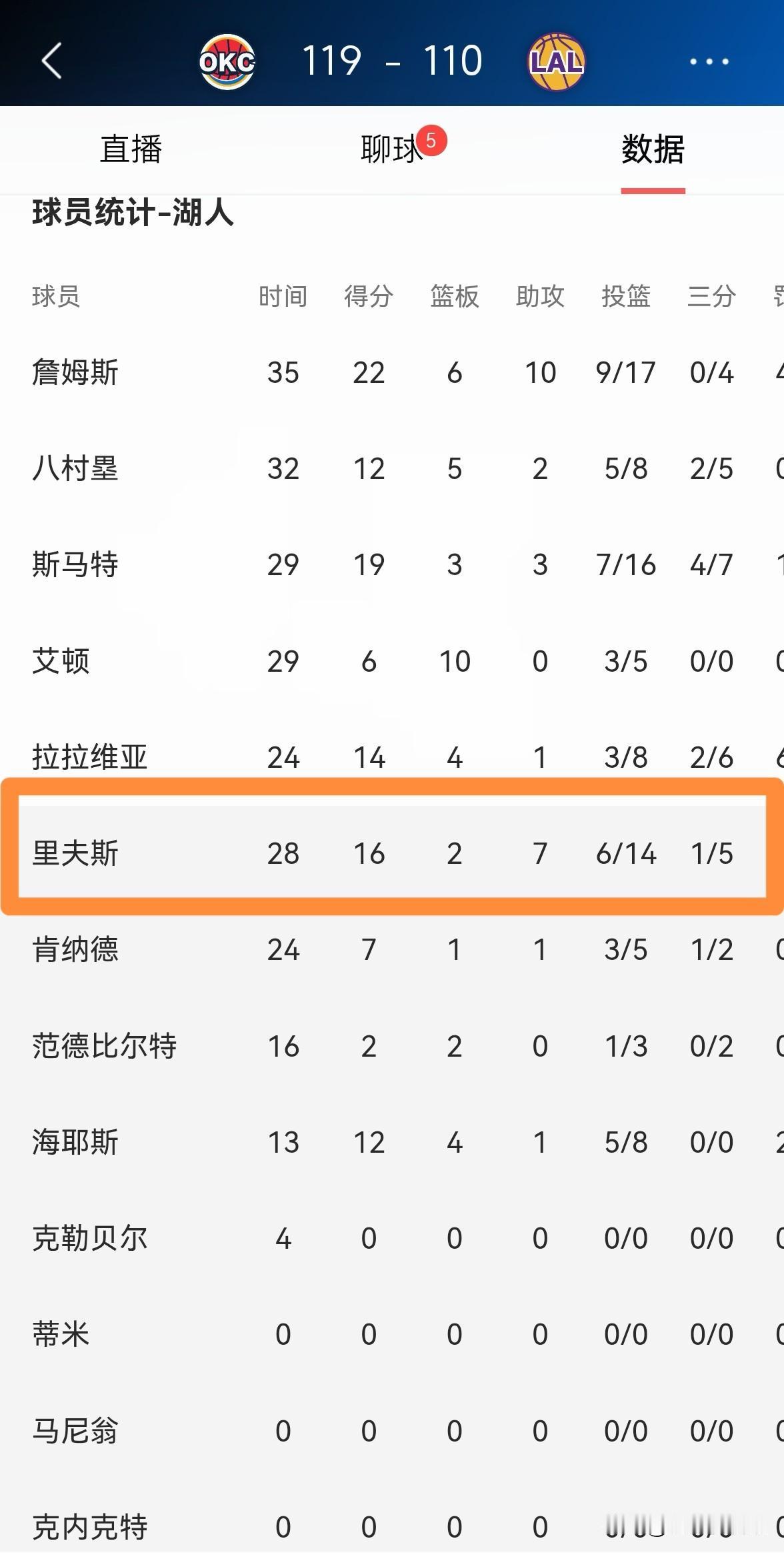 湖人超级球星里弗斯真是状态堪忧!在今天湖人主场以110:119输给雷霆的比赛中,里弗斯的表现非常的低迷,他在替补出战的28分钟里,投篮14中6,其中三分球5中1、罚球3中3得到16分,出现了全队最多的5次失误,他的场上正负值为球队最低的-14。 老实说,以里弗斯目前的糟糕状态来看,湖人恐怕要经历一波连败了。