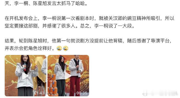 陈星旭李一桐金枝开机现场太抓马了。李一桐一通发言后,陈星旭直接说剧方没通知他背稿🆘 他该不会觉得自己很幽默吧开机准备发言稿这种东西居然还需要剧方通知的吗?