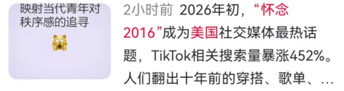 把时间拨回到2026年初,如果你此刻打开美国的社交网络,会发现一种奇怪的氛围正在蔓延。在这个本该展望未来的时刻,无数人却选择集体“向后看”。“怀念2016”这几个字,像一场突如其来的流行感冒,迅速传染了整个美国的舆论场。这不仅仅是一个热搜话题,更像是一次集体性的心理“撤退”。 数据不会说谎。在TikTok这个最受年轻人青睐的平台上,与“2016”相关的搜索量在一夜之间暴涨了452%。这是什么概念?意味着成千上万的用户,尤其是那些被称为Z世代的年轻人,正在疯狂挖掘十年前的数字痕迹。那时候的穿搭风格、那时候的流行歌单、甚至是那时候低清的表情包,都被重新翻了出来,摆在了2026年的聚光灯下。这哪里是简单的怀旧,分明就像是在打捞一艘沉船,试图从过去的碎片里寻找点什么。 对于很多局外人来说,2016年似乎并不是一个完美的年份。那一年,英国脱欧,美国大选结果震惊全球,种种不确定性已经开始萌芽。但在2026年的美国年轻人眼中,那一年竟然成了一座无法逾越的“黄金时代”标杆。为什么会出现这种巨大的认知反差? 媒体分析人士敏锐地捕捉到了这股浪潮背后的潜台词。这不仅仅是喜欢十年前的音乐那么简单,这背后交织着复杂的现实焦虑、政治撕裂带来的疲惫感,以及一种深深的“数字文化疲劳”。在他们的叙述中,2016年仿佛是一个分水岭。那一年,世界虽然也有喧嚣,但似乎还有一种可以被理解的秩序感。 走在2026年的街头,Z世代们翻看十年前的手机界面,那时候的社交媒体还没有现在这般复杂的算法控制,人与人之间的争吵似乎也没现在这般不可开交。他们怀念的,是那种“更稳定”的时代错觉。那时候,大家担心的可能只是哪首歌更好听,而不是像现在这样,每天一睁眼就要面对通货膨胀的压力、极端政治立场的相互攻击,以及对未来某种深层的恐慌。 这种怀旧潮的爆发点,精准地击中了当代美国青年的痛点。在TikTok那些复古滤镜的视频下,评论区里往往充满了对现实的无奈。有人说,2016年是最后的“纯真年代”,那之后的世界就像脱了轨的列车。这种心理投射,让2016年从一个普通的时间年份,变成了一种精神避难所。 值得注意的是,这种怀旧并非单向的情感宣泄,它反过来也映射了当下美国社会的深层裂痕。政治撕裂让人们在现实社交中如履薄冰,不敢轻易表达观点;快节奏、高压力的数字生活让大家感到窒息。于是,躲回2016年的文化气泡里,成了一种低成本的自我疗愈。 现在的2016年,在某种意义上已经被“神化”了。它被剥离了当年的具体麻烦,被赋予了太多美好的想象。年轻人翻出的不仅仅是旧照片,更是对当下的一种无声抗议。他们怀念的,是那个还没有被当下这些复杂问题彻底压垮的时代,是那个似乎还有希望、还有确定感的昨天。 这场关于“怀念2016”的狂欢,与其说是对过去的致敬,不如说是对现实的某种“逃票”。在那暴涨的452%搜索量背后,是一颗颗渴望安稳、厌倦纷争的心。对于观察者来说,这不仅是一个互联网文化现象,更是一份精准的社会心理切片,它告诉我们在2026年这个节点,美国社会最缺的到底是什么。这种情绪的蔓延,或许还会持续很长一段时间,直到人们找到新的出口,或者直到2016年这个“避风港”也不再安全。 以上内容仅供参考和借鉴