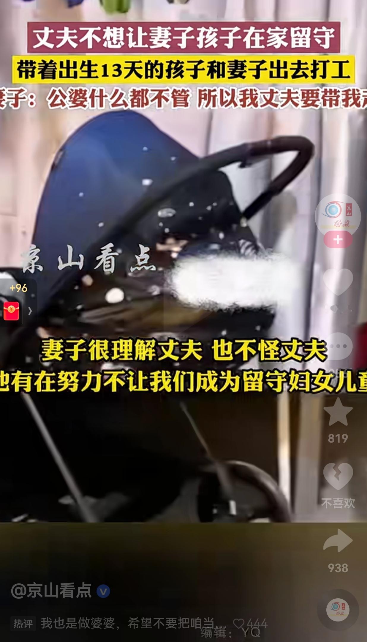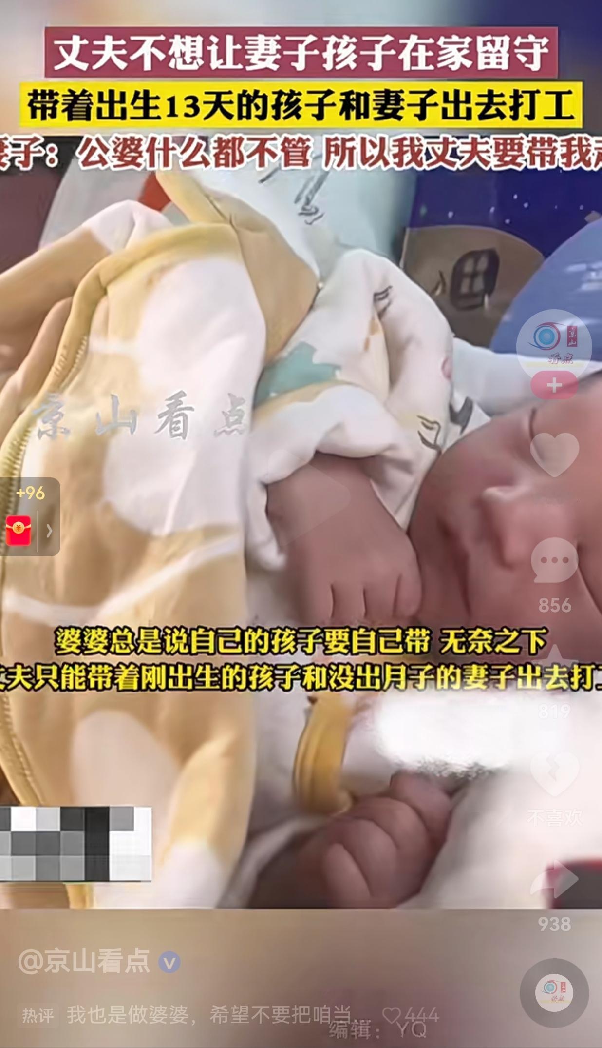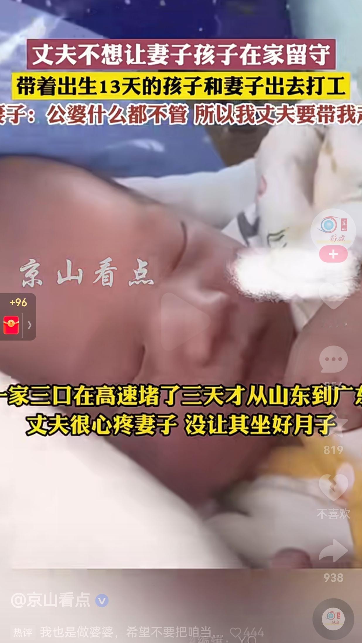 想想都心酸!但是,这是你们小夫妻必须要承担的责任!孩子才13天,丈夫就带着没出月子的妻子和孩子去打工,只因家里父母不管不问,丈夫只能做出这种选择。 刚刚刷到了一个视频,看得我鼻子一酸。 事情是这样的,山东一对夫妻,孩子才出生13天,丈夫开着车就带着没出月子的妻子和襁褓里的宝宝,踏上了去广东打工的路。 高速上堵了整整三天,一家三口挤在狭小的车厢里,宝宝在妈妈的怀里安睡,妻子虚弱地靠在一边,丈夫握着方向盘,眼神里全是心疼和无奈。 妻子说:“公婆什么都不管,总说自己的孩子要自己带。没办法,我丈夫不想让我和孩子在家留守,所以只能带着我们一起走。” 此事传到了网上,引发无数网友的热议和共鸣,有的网友说:“我当年也是,老婆刚出月子,我就带着她和娃去了深圳。那时候租的房子只有10平米,夏天热得像蒸笼,可我们一家三口挤在一起,心里是暖的。” 还有的网友说:“这公婆也挺狠心呐!儿子在最困难的时候,你不愿意帮助他。等你们年纪大了,就算儿子不说什么,你能保证儿媳妇对你没有怨言吗?” 看完这个视频,我感觉特别心疼这一家三口的遭遇。他之所以拖家带口选择出门打工,不是狠心,是真的没得选。 如果公婆能搭把手,如果家里能有个依靠,哪个男人愿意让刚生完孩子的老婆,跟着自己在高速上堵三天三夜?哪个爸爸愿意让才13天的宝宝,跟着自己颠沛流离? 他只是不想让妻子在家受委屈,不想让孩子从小就没有爸爸的陪伴。 他宁愿自己扛下所有的苦,也不想让妻儿成为留守妇女、留守儿童。 就像评论区里说的:“他带的不是累赘,是他的全世界。他宁愿苦一点,也不想让老婆孩子在家受气。” 妻子说,她不怪丈夫,她理解他的不容易。 这句话,戳中了多少人的心。在这个年代,多少夫妻为了养家糊口,被迫两地分居。妻子在家带娃,丈夫在外打工,一年见不了几次面,孩子对爸爸的印象,只停留在视频里。 可这个男人,偏偏选择了一条更难的路。他宁愿带着妻儿一起吃苦,也不愿让她们独自面对生活的琐碎和公婆的冷漠。 而这个女人,也选择了无条件的信任。她知道跟着他会很苦,会很累,可她还是义无反顾地跟着他走。 因为她知道,这个男人,会拼尽全力护她和孩子周全。 我们总说,生活应该是诗和远方可现实却是,大多数人为了柴米油盐已经付出全部的心血。 我们总说,父母应该给孩子最好的生活,可现实却是,很多父母连陪伴都成了奢望。 可这个男人,用自己的实际行动告诉我们:夫妻过好日子,并不是住多大的房子,开多好的车,而是一家人在一起,就算吃点苦,心里也是甜的。 大家觉得呢?欢迎大家评论区讨论留言。
