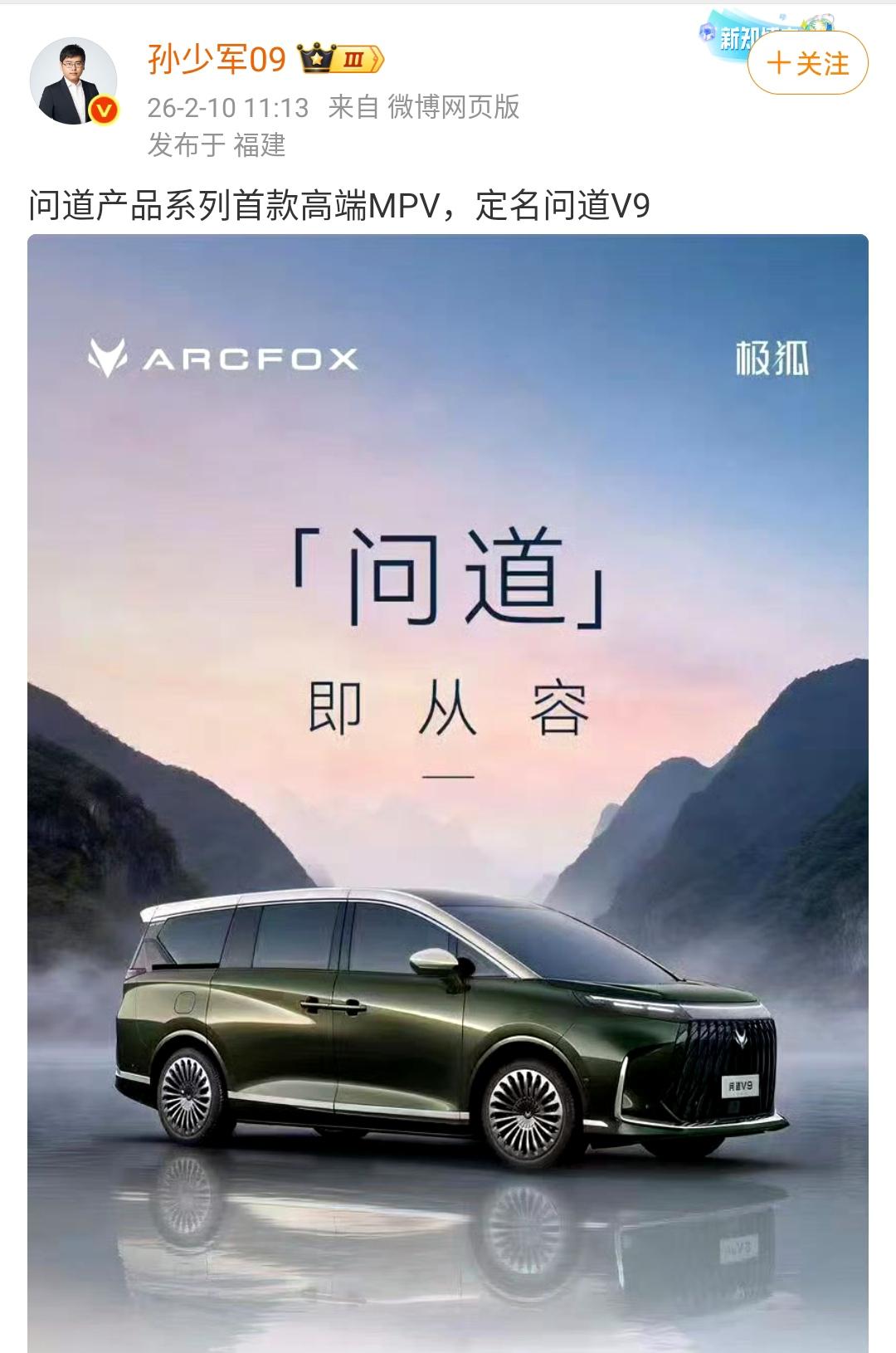 孙少军:问道产品系列首款高端MPV,定名问道V9​! 这是极狐旗下的一个全新