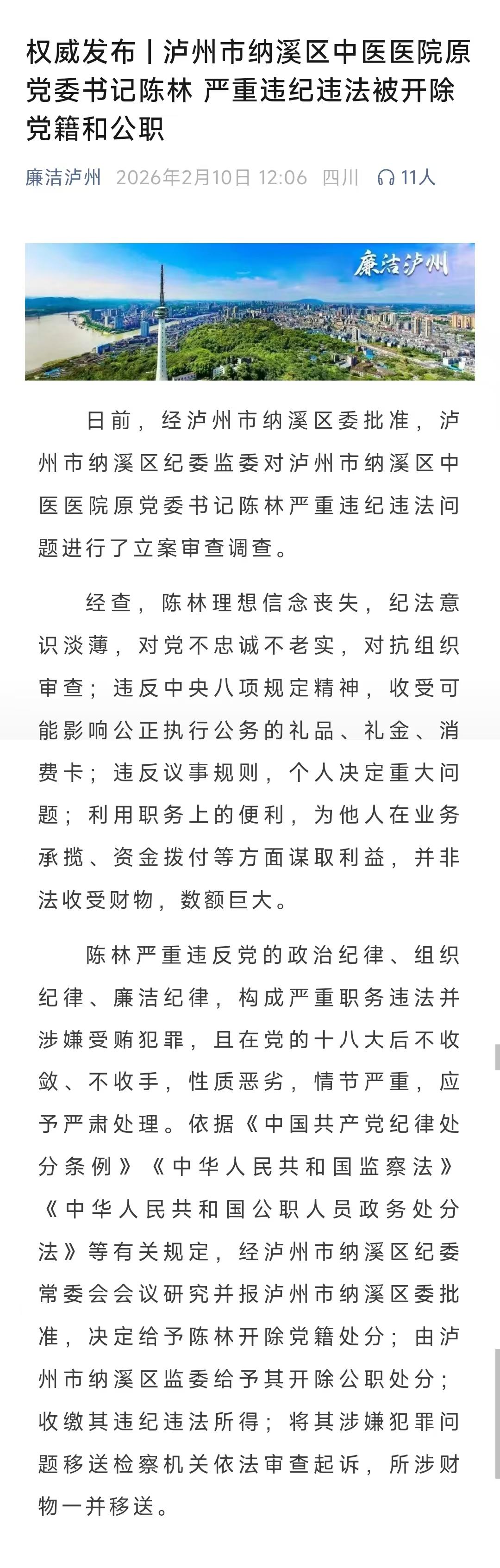 靴子落地!泸州市纳溪区中医医院陈林的问题终于水落石出。 这个陈林也不简单,他曾经在泸州市纳溪区的医药系统工作多年。 他是1978年11月生人,土生土长的四川泸州人,学历不高,拥有在职大学学历。 从2002年2月开始参加工作,早年期间在泸州市纳溪区龙车镇卫生院,天仙镇卫生院工作,这个时候还籍籍无名。 高升的时候应该是在2015年7月,37岁的陈林,这时候已经离开了乡镇卫生院,晋升为泸州市纳溪区疾病预防控制中心副主任。在这一核心岗位上工作不久,便调往了泸西市纳溪区中医医院,在这家医院工作时间最长,先后担任这家医院副院长、院长。 并且于2024年4月,正式担任泸州市纳溪区中医医院党委书记职务。 于2025年11月,东窗事发,官宣落马。 这里的泸州市纳溪区中医医院,是泸州市纳溪区卫生健康局所属的公益二类事业单位,是一所集医疗、教学、科研、预防、康复为一体的中西医结合并重的区级中医医院。 纵观他的履历,有长达10余年的乡镇卫生院工作经历,之后还在区疾控中心履任要职,尤其是在泸州市纳溪区中医医院,担任核心岗位超过10年。 他本应该在履职期间利用手中的职权,为全医院的患者以及医护人员做好权益保障,然而他并没有做到! 经过组织队伍的严查,发现他在履职期间,主要有以下违纪违法行为。 1、在履职期间,收受可能影响公正执行公务的礼品、礼金、消费卡。 2、违反议事规则,个人决定重大问题。(可见其比较专制,搞一言堂。) 3、利用职务上的便利,为他人在业务承揽、资金拨付等方面谋取利益,并非法收受财物,数额巨大。(这里的数额巨大,已经说的很明显了。) 正所谓法网恢恢,疏而不漏,陈林最终也因为自己内心的贪婪欲望,彻底栽倒在了47岁的年纪,前途尽毁,身陷囹圄,这或许就是触碰法律红线的反噬。