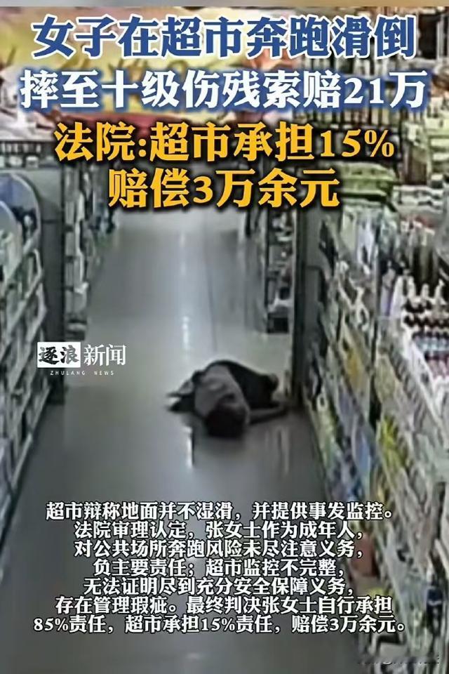江苏南京,女子带孙子逛超市,一不小心把手机忘在水果区了,女子发现后一路小跑回去拿手机,结果脚一滑摔了个狗啃泥,还骨折了。事后,女子非说超市没有安全警示标志,地上还有水,要求他们赔偿21万。 据逐浪新闻报道,张女士已经退休了,平时她的主要任务就是在家干家务和照顾孙子。 案发当天,张女士看冰箱空了,就领着孙子去超市里买点蔬菜水果。 张女士的孙子刚好是爱玩爱闹的年纪,一进了店里,小孙子就像鱼儿进了水里,他在里面疯跑,一会摸摸这个,一会动动那个。 张女士一边推着车买东西,一边还要时刻盯着小孙子,防止他跑丢了。 祖孙两个走到买水果的地方,张女士停下来挑了一点水果,顺手将手机放在了堆放水果的台子上。 挑了一袋水果后,张女士抬眼一看,小孙子又去搞破坏了,她赶紧走过去拉住他,又带着他去给水果称重,一来二去,就把手机忘记了。 买完东西,张女士准备付钱,一摸口袋手机不见了,她这才想起来,刚刚手机放在了水果区没拿。 张女士嘱咐小孙子在那站着别动,又托旁边的店员帮她看一分钟孩子,一溜烟就往水果区跑去。 店里的地面比较光滑,张女士惦记着孙子比较着急,跑得比较快,结果跑到半路上,张女士脚下一滑,摔了个四脚朝天。 张女士感觉一阵剧痛,躺在地上不能动了,幸亏旁边的店员听见动静,立即打了120,又通知了张女士的家属。 经过检查,张女士这一跤摔得可不轻,因为摔倒的角度刁钻,张女士胸12椎体压缩性骨折,构成了十级伤残。 那么,十级伤残属于什么概念? 人体损伤一共分为10个等级,10级伤残属于伤残等级中最轻的一级,通常指因各种原因导致人体组织器官结构破坏或功能障碍,使日常生活能力、工作和学习能力、社会交往能力等受到轻度影响。 也就是说,10级伤残会对人体造成轻微影响,但并不严重。 张女士摔倒后,觉得自己摔跤,是因为店里的地面比较滑,而且地上也没有贴安全警示标志导致的。 张女士说,如果店里提醒了,自己肯定就不会跑,也就不会摔跤。 店里非常气愤,他们辩解说,店里的地面既没有水,也不滑,张女士自己在瓷砖地面上跑摔跤,和他们没关系。 店里还提供了案发当天的监控视频,视频显示,张女士在两排货架中奔跑,还没散出货架就摔了一跤,随后就躺在地上了。 张女士摔倒,超市是否需要承担责任? 《民法典》第一千一百九十八条规定,宾馆、商场、银行、车站、机场、体育场馆、娱乐场所等经营场所、公共场所的经营者、管理者或者群众性活动的组织者,未尽到安全保障义务,造成他人损害的,应当承担侵权责任。 张女士称超市地面滑且无安全警示标志,而超市辩解地面无水不滑。 经审理认为,店里提供的监控不完整,只拍到了张女士摔倒的过程,没拍到最开始张女士打滑时地面的情况,店里提供的监控无法证明他们尽到了充分的安全保障义务。 另一方面,张女士作为成年人,具有完全民事行为能力,对在公共场所奔跑的风险应该有足够的认识和判断。 张女士因为着急去拿手机,在超市里快速奔跑,没有尽到自身的注意义务。 根据《民法典》中关于过错责任的相关规定,被侵权人对同一损害的发生或者扩大有过错的,可以减轻侵权人的责任。 所以,张女士自己要对此次摔倒承担主要责任。 最终,一审判张女士自行承担85%的责任,超市承担15%的责任,赔偿张女士3万余元。