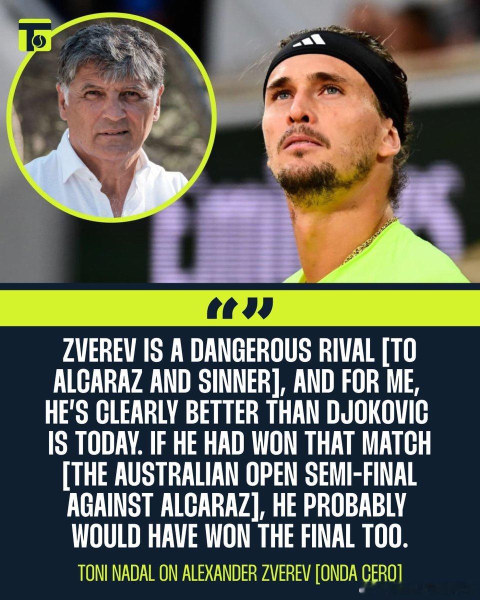 托尼纳达尔声称兹维列夫比德约科维奇“明显更好”,是阿尔卡拉斯和辛纳的“危险对手”。