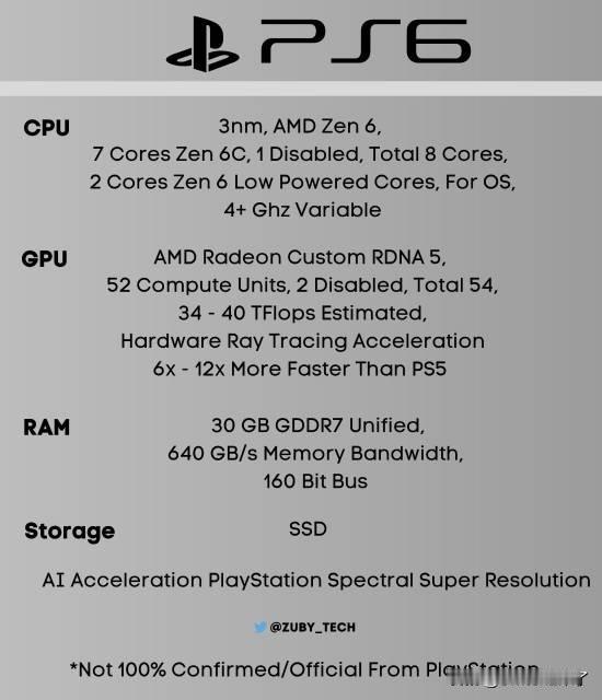 随着2026年的到来,关于索尼下一代主机 PlayStation 6的传闻进入了实质性的规格曝光阶段。 近日,知名博主Zuby_Tech根据业内流传的配置信息,汇总并制作了一张详尽的硬件图表,展示了这款未来机型令人咋舌的账面数据。 根据爆料,PS6将实现从处理器到存储架构的全方位飞跃。业内预计,凭借如此强悍的配置,PS6 的目标是实现 4K 分辨率下的 120 帧锁定运行。 然而,高昂的 GDDR7 内存和 3nm 芯片成本也引发了市场对 PS6 定价的担忧。