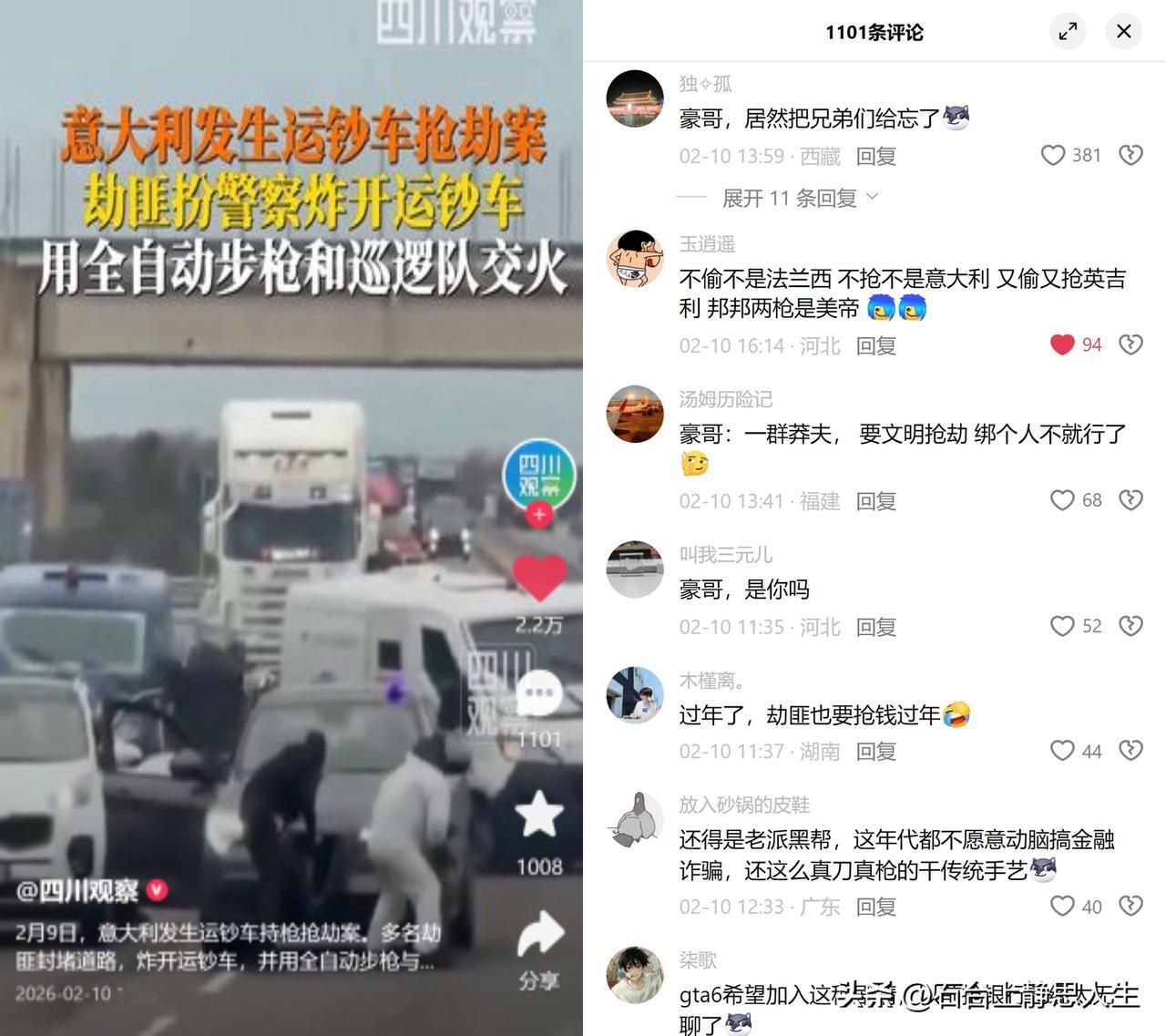 意大利劫案,像极了好莱坞大片。 一群劫匪伪装成帽子叔叔,封路、炸车、拿自动步枪跟帽子叔叔交火,整套动作专业得像按剧本走。最后钱没抢到,抓了俩嫌疑人,其他人还在逃。 网上全是玩梗的,GTA剧情、豪哥的玩笑话刷了屏。大家乐呵着,心里却都门儿清,这哪儿是电影,是真实的治安漏洞被摆到了台面上。 现在的犯罪越来越讲究工业化:分工明确、工具专业、战术到位,就像流水线上出的产品。可这边治安系统的反应,总像慢了半拍。并非帽子叔叔不用力,只是面对组织化的对手,老办法有时候真不好使。 大家拿梗当遮羞布,只是不想直面这种事可能落到自己头上的恐惧,毕竟真较真起来,只剩后怕。 当犯罪都开始讲流程,我们该警惕的,远不止这一场没抢到钱的劫案。