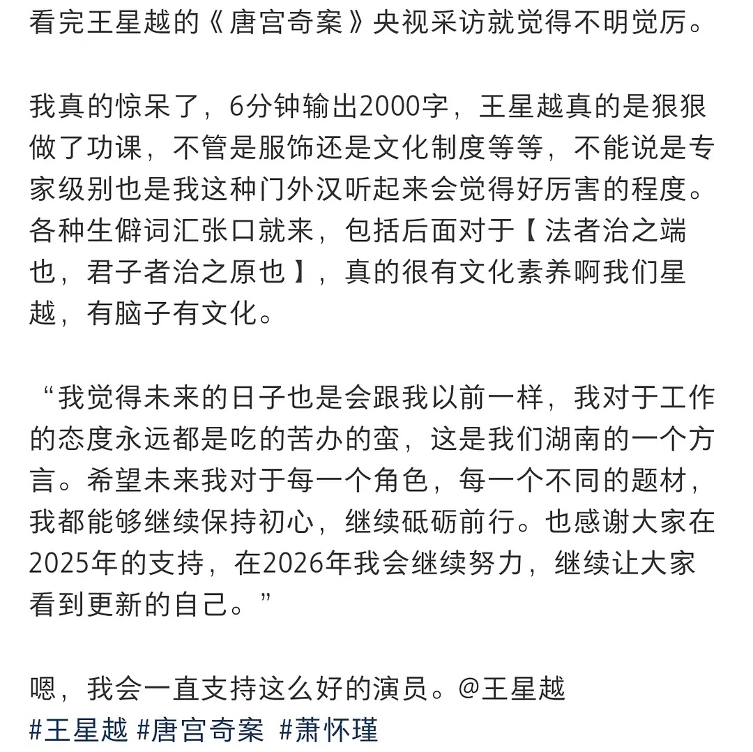 剧宣都宣传到了央视新闻了,非常优秀了。他剧播期间还发🧧云包场一个不落下,王星越作为男主萧怀瑾也尽心尽力了!