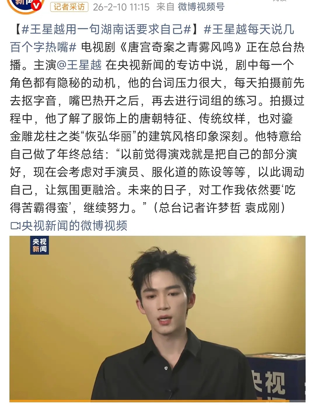 王星越央视专访《唐宫奇案》现在演戏会考虑对手演员、服装陈设等剧宣都宣传到了央视新
