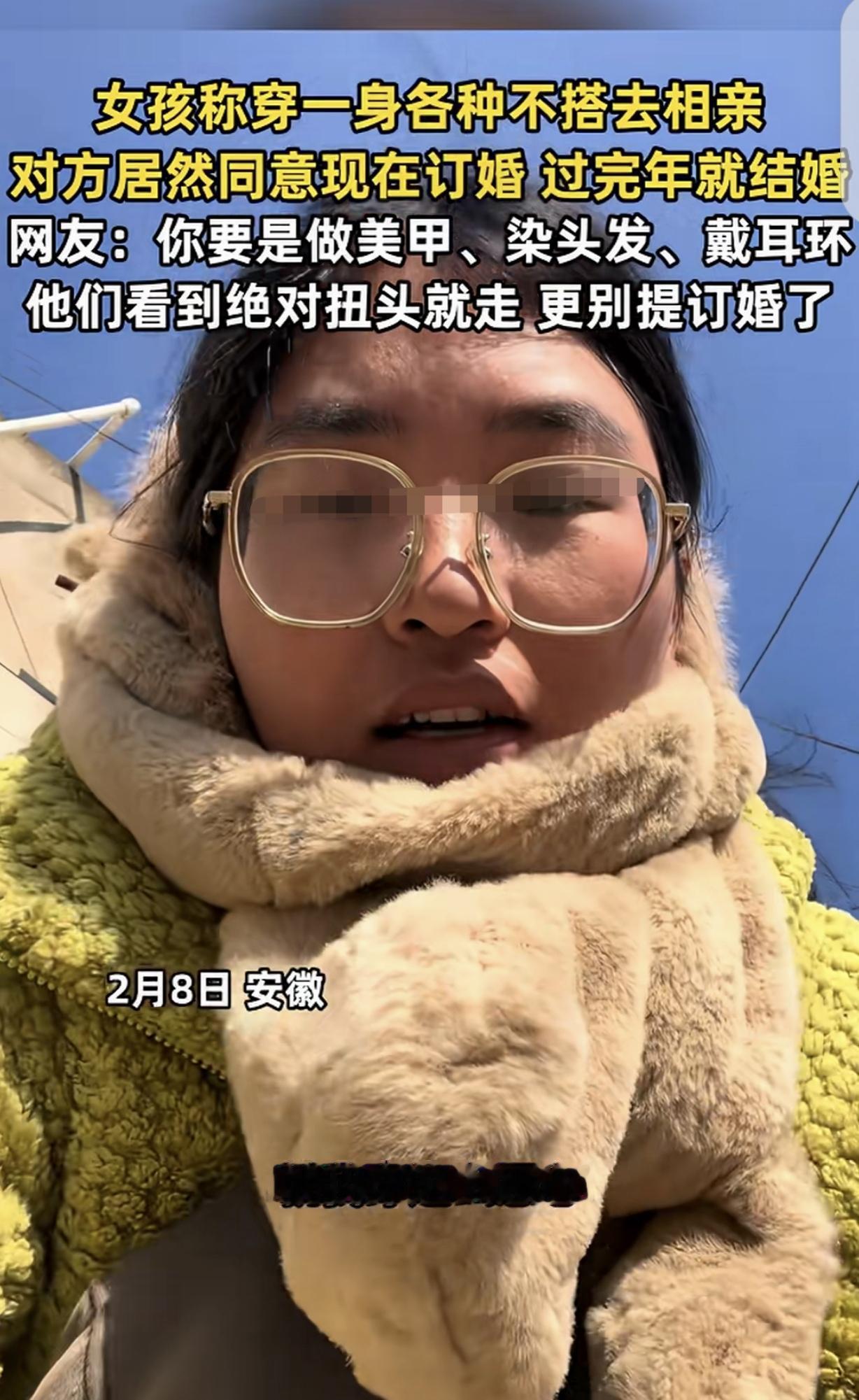 “男人都饿到饥不择食的程度了吗?”安徽,一女子家里催婚,媒人给她介绍了个对象,女子讨厌相亲,她本身就长的不漂亮,然后又故意把自己打扮成“小丑”,想把相亲男恶心跑。万万没想到,男子看到她眼睛发亮,不但要马上订婚,还说过完年就结婚,女子顿时懵圈,她直呼:有些男的真的是饿了!可网友一番话,让女子恍然大悟。 镜头没有对准相亲饭桌上的推杯换盏,而是死死锁定在一面充满了“视觉灾难”的穿衣镜前。镜子里映出的不是一位待嫁新娘,而是一个精心设计的“事故现场”。 一件黄绿色的毛绒棉衣,颜色扎眼得让人想起没熟透的猕猴桃。下身是一条毫无版型可言的咖啡色抓绒裤。 往腰上一看,哪有什么曲线,活脱脱像个行走的水桶。为了确保万无一失,她甚至在那条米色围巾上打了个笨重的大疙瘩。 加上那副几乎遮住半张脸的大框眼镜,还有那天早晨刻意没洗的脸和抓得像鸟窝一样的头发。这不是为了悦己,这是一场防御战。这位大龄单身女青年的算盘打得震天响:只要我足够丑,就能兵不血刃地把相亲对象吓跑。 在这个“颜值即正义”的时代,她笃定没有哪个男人愿意领着这样一个“土味大妈”回家过年。现实给出的剧本,往往比最荒诞的小说还要离谱。 当她带着这身行头坐到相亲桌对面时,预想中的嫌弃眼神并没有出现。对面的男人没有找借口上厕所遁逃,反而眼神一下子亮了。 那是一种猎人看到猎物时的兴奋。紧接着是一连串查户口般的高频提问,甚至没等这顿饭吃完,对方就抛出了底牌。 “我们要不马上订婚吧?过了年就办婚礼。”这句话像一颗雷,把女子彻底炸懵了。她坐在那里,看着眼前这个男人,大脑一片空白。 是自己今天的妆造还不够“毁容”?还是这个男人的审美系统出了重大故障?回到家后,她甚至怀疑人生地把这段经历发到了网上,配文带着深深的困惑:“现在的男人,都饿到这种饥不择食的程度了吗?” “饿了”,这是她能找到的唯一解释。在她看来,男人都是视觉动物,面对一个不修边幅的“黄脸婆”还能下嘴,除了生理性饥渴,还能是什么? 但评论区里的几千条留言,却冷冰冰地撕开了这层温情脉脉的面纱,露出底下那套精密得可怕的生存算法。 网友们的回答极其毒舌,却又一针见血:“妹子,他不是饿,他是精明。”这根本不是一道关于美丑的审美题,而是一道关于成本的数学题。 在那个男人的算盘里,你的“丑”被瞬间转译成了一连串极具吸引力的经济指标。你不化妆,意味着婚后的维护成本极低。你穿着旧衣赴约,暗示你消费欲望低,大概率是个勤俭持家的好手。 更残忍的逻辑在于,你这身打扮释放了一个巨大的信号:安全。在这个充满诱惑的世界里,一个不爱打扮的老婆,意味着极低的出轨风险。 相比那些浓妆艳抹、浑身散发着“我很贵”气息的女性,眼前这个“土得掉渣”的女人,才是最优质的长期持有资产。 这才是当下农村婚恋市场最真实的残酷物语。尤其是在男多女少的大背景下,对于很多早已过了而立之年的男性来说,寻找爱情是奢侈品,寻找生存搭子才是必需品。 那个男人眼里的光,不是因为心动,而是因为看到了“性价比”。他不需要一个供在神坛上的仙女,他需要一个能生养、懂事、并且极其省钱的队友。 所谓的“闪电求婚”,不过是一次高效的资源锁定。他怕稍微慢一步,这个看起来既实惠又安全的“经济适用型”猎物就被别人抢走了。 这场相亲,本质上是一次巨大的错位。女子还在用浪漫主义的思维,试图筛选出那个能让她“怦然心动”的人。 而男人早已进化成了极致的现实主义者,拿着计算器在衡量每一个毛孔的折旧率。女子以为那件黄绿色的棉袄是劝退的雷区,殊不知在对方眼里,那是“宜家宜室”的最高认证。 你说有些男人是饿了吗?不,他们吃相也许难看,但心里比谁都清楚,这桌菜到底值多少钱。