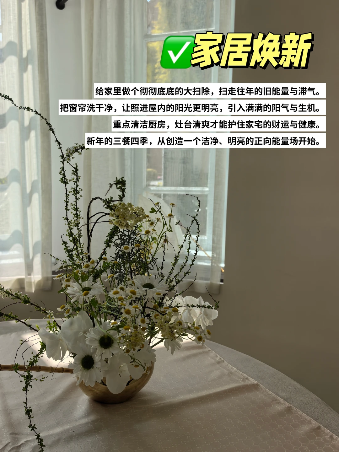 给家里做彻彻底底大扫除,扫走往年的旧能量与滞气。把窗帘洗干净,引入满满的阳气与生机。清洁厨房,灶台清爽才能护住家宅的财运与健康。新年的三餐四季,从创造一个洁净、明亮的正向能量场开始。