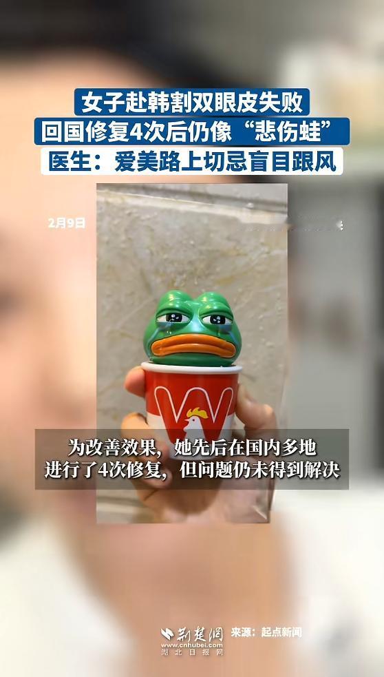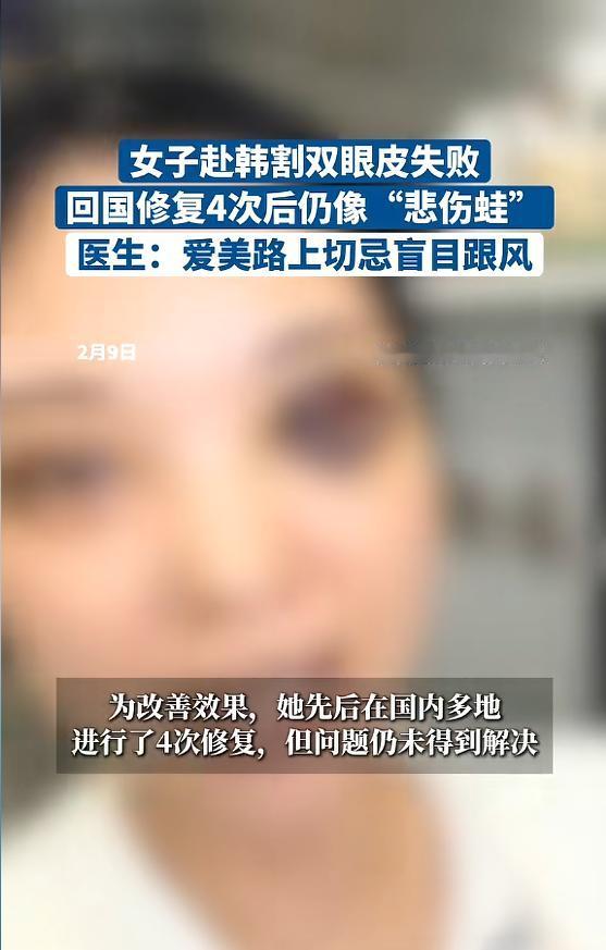 “悲剧还是发生了!”近日,福建福州,一女子为了变美,专门跑去韩国去做双眼皮手术,还要做欧式平行大双的款式,没想到消肿后,眼皮像两根大肉条,她自己都调侃说像“悲伤蛙”,女子回国后,进行了4次修复手术,但没什么效果!网友:这下后悔了吧! 福州市第一总医院的整形外科诊室里,空气有些凝固。此时正值一月中旬,窗外是正在为春节和寒假预热的热闹街景,但诊室内的氛围却冷得像冰窖。 坐在郭国祥主任对面的,是一位包裹得严严实实的女子。当她缓缓摘下口罩和墨镜,在这个年手术量超过一千例的资深专家面前,露出了一双让人倒吸一口凉气的眼睛。 那不是她梦想中灵动深邃的“欧式大眼”,而是两条沉重、浮肿的肉条,死死压在眼眶上。原本应该传递神采的眸子,此刻透出的全是疲惫和躲闪。甚至连她自己都忍不住自嘲,现在的样子,像极了网络表情包里那只颓丧的“悲伤蛙”。 这是一个典型的、令人唏嘘的“审美难民”样本。为了这张脸,她曾怀揣着巨大的憧憬飞往韩国。在那里的手术台上,她对医生反复强调了一个执念:要做“欧式平行大双”。 在她的想象里,双眼皮越宽,眼睛就越大,上镜就越像那些自带滤镜的网红。韩国的医生满足了她的要求,大刀阔斧地切开了她的眼睑。当漫长的术后消肿期过去,镜子里出现的不是混血感的芭比,而是一场灾难。 眼皮宽得离谱,人工痕迹重得像贴了两条胶带,原本清秀的东方眼型被彻底破坏。如果说初次手术的失败是一记闷棍,那么回国后的经历就是一场凌迟。为了挽救这双眼睛,她像个无头苍蝇一样在国内辗转了多个城市,前前后后经历了4次修复手术。每一次躺上手术台,她都期待着奇迹,但每一次醒来,面对的都是更深的绝望。 直到这个寒冬,她带着最后的一丝希冀找到了郭国祥。但遗憾的是,医学不是魔法,更不是橡皮泥。郭主任的诊断残酷而精准:问题不在于之前的医生修补得不够努力,而在于初次手术时的“减法”做得太绝了。 当初在韩国的那一刀,切除了过多的眼睑脂肪和皮肤。整形外科有一条铁律,组织切除是不可逆的。一旦皮肤和脂肪被丢进了医疗垃圾桶,再高明的医生也面临“无米之炊”的窘境。 想要把被切掉的组织凭空变回来,这违背了生物学常识。如今的她,付出的代价远不止金钱。因为这双“悲伤蛙”式的眼睛,她几乎切断了社交。 不敢出门,不敢和人对视,生怕别人盯着她的眼睛看。曾经为了变美是为了更好地生活,如今却因为变美而失去了生活,这不得不说是一种黑色的讽刺。 而讽刺的是,诊室之外,正有一大批跃跃欲试的“后继者”在排队。眼下正值寒假,又临近春节,是医美行业的“扎堆季”。学生党和教师群体即便排队一个月也要挤在这个时间点,为的就是利用半个月的消肿期和随后3到6个月的自然恢复期,试图在假期里完成一次“蜕变”。 但在郭国祥看来,这种狂热背后埋着巨大的雷区。社交媒体上那些浓妆艳抹、滤镜叠加的“网红眼”,放在手机屏幕里或许是美的,但一旦硬生生搬到普通人素颜的脸上,就是一场灾难。 这种审美错位,正在制造一批又一批像福州这位女子一样的后悔者。特别是对于那些还没满18岁的学生,郭主任更是直接划出了红线。 骨骼发育还没定型,心智审美还在摇摆,这时候盲目去做不可逆的全切手术,无异于在拿未来做赌注。如果非要做,首选也应该是可逆的埋线,给自己留一条退路。 变美这条路上,从来没有捷径可走。当那位女子重新戴上墨镜遮住那双“悲伤蛙”的眼睛时,她留给诊室的背影显得格外沉重。 这是一记警钟,敲给每一个试图通过一刀切来改变命运的人听:理性的审美评估,远比盲目的跨国朝圣要重要得多。