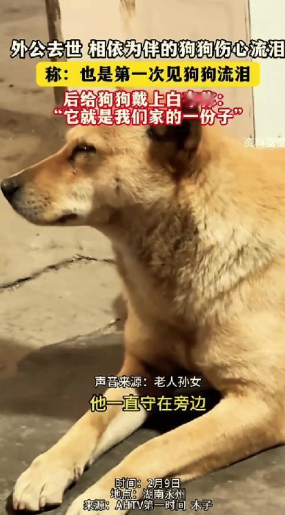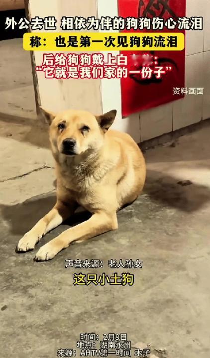 万物有灵,湖南,女子外公去世,家人刚把他抬进棺材,养了两年的小狗突然走过来趴在棺材前面,怎么喊也喊不走,走近一看才发现小狗竟在默默流泪。 农村的白事通常充斥着琐碎的忙乱和哭丧声,但在这一天的入棺时刻,空气里却凝固着一种罕见的静默。 所有人的目光都被棺材前的一团黄色身影锁住了。那不是什么仪式摆件,是一只普普通通的中华田园犬。 就在家人们合力将老人的遗体抬进寿材,准备合上盖子的那一刻,物理隔绝即将生效。这只狗突然冲了过来,死死趴在棺材前,像是一道怎么也撕不下来的封条。 有人试图去拉它,但这平日里温顺的家伙展现出了一种惊人的固执。它不叫,不咬,只是把头贴在冰冷的木头上,那一滩洇湿地面的液体,让人心头一颤那是从它眼眶里溢出来的眼泪。 把时间轴往回拉两年,这只狗其实是带着“救命”的任务来的。那时候外婆刚走,老爷子的世界坍塌了一半。为了填补那个巨大的情感黑洞,家里人抱回了它。 七百多个日夜,它不只是一只宠物,它是老人手里的拐杖,是脚边的影子。日升月落,它完美地替代了原本属于外婆的那个生态位,成了老人晚年最亲密的“室友”。 可现在,影子还在,正主却没了。对于这只狗来说,这是一场双重维度的崩塌:它不仅失去了主人,更失去了它在这个家庭里存在的职业意义。 外公离世的那天,其实它就已经“破防”了。家里人回忆,它整天眼眶通红,寸步不离地守着遗体。这种反常的生物焦虑,根本没法用“巧合”来解释。 当看到它伏在棺材前默默流泪的那一刻,家属们的心理防线彻底决堤。那不是生理性的泪腺分泌,那是一场跨越物种的悲伤实体化。 那一刻,家里人做了一个极具分量的决定:他们扯过一段白布,郑重地系在了狗的脖子上。在传统的宗族礼仪里,这不仅仅是一个动作,这是一次身份的越迁。这块白布意味着,它不再是看家护院的畜生,它是披麻戴孝的“亲属”,是这个家庭里正儿八经的一份子。 出殡的队伍上了路,那场面看得人心里发酸。不用人牵,也不用人赶,这只戴着孝布的黄狗自觉走在队伍的最前头。 它一步都没落下,步伐沉稳得像个懂事的大人。它不乱跑,也不吠叫,只是偶尔停下来,回头深深地望一眼身后的灵柩。 那个眼神太好懂了,它是在确认老爷子跟上了没。作为曾经的守护者,它在执行最后的职责:做亡灵的引路人,把这个世界上最爱它的人,安安稳稳地送到另一个世界去。 外公走得急,没留下什么长篇大论的遗嘱,但这只流泪的狗,本身就是一份活着的契约。看着它在风中飘荡的白孝布,外孙女把话撂在了风里:“往后的日子,我们会替外公好好照顾它。” 这是一场没有签字仪式的交接。外公爱狗,狗守外公,现在家人接过了接力棒。棺材埋进了土里,但这份人情味儿,稳稳地留在了地面上。 万物有灵这四个字,以前可能只是书本上的成语,但在湖南永州的这个二月天里,它具象得让人想哭。