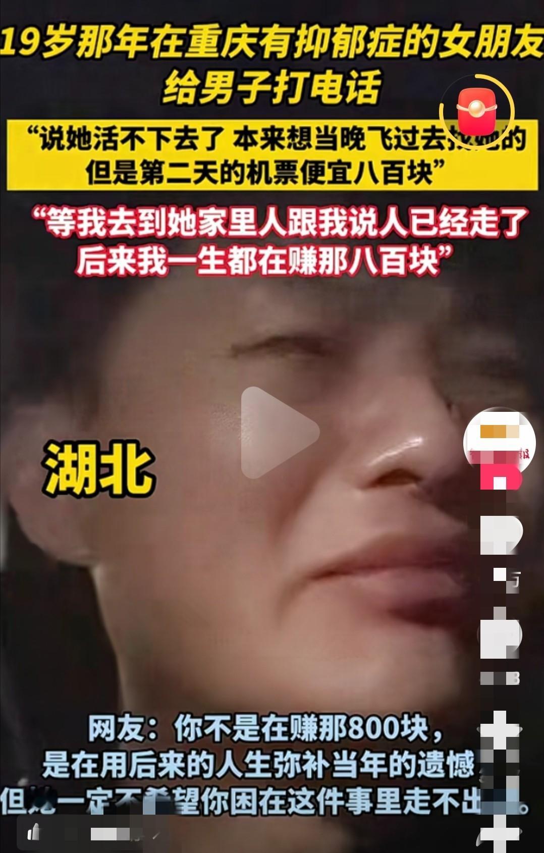 “泪目了”湖北一男子19岁的时候谈的女朋友患有严重的抑郁症,打电话说很想见他,当时他为了省800块钱飞机票,迟了一天去见女朋友,最后两人阴阳两隔。 湖北一名男子刚满19岁,还在上大学,女孩和他同龄,两人在一次朋友聚会上相识,慢慢走到了一起。 相处没多久,女孩就坦诚地告诉了他,自己患有严重的抑郁症,经常会陷入情绪低谷,甚至有过轻生的念头。男子没有丝毫退缩,反而更加心疼女孩,下定决心,要一直陪着她,守护着她,帮她走出阴霾。 女孩的抑郁症时好时坏,好的时候,会笑着和他规划未来,说等两人毕业,就找一份稳定的工作,一起租房,一起做饭,平平淡淡地过日子;可情绪不好的时候,就会变得格外脆弱,反复问他,是不是会一直陪着自己,是不是会嫌弃自己。 男子每次都会紧紧抱着她,一遍又一遍地告诉她,自己会一直陪着她,永远不会嫌弃她,让她不要多想。 他以为,只要自己足够坚持,足够用心,就一定能陪着女孩走出抑郁症的阴影,就能和她一起,走到未来。可他万万没想到,一场因为“省钱”的侥幸,彻底打碎了所有的期待。 事发那天夜里,已经是凌晨时分,男子正在宿舍熟睡,突然被手机铃声吵醒,是女孩打来的电话。 电话接通后,女孩的声音虚弱得几乎听不清,带着浓浓的哽咽和无助,反复说着“我好想见你”“我好难受”“你能不能过来陪陪我”,语气里的绝望,隔着电话,都能清晰地感受到。 男子瞬间清醒过来,心里一下子揪得慌,他能感觉到,女孩当时的状态很不好,随时都可能发生危险。 他立刻起身,打开手机,查询当天从自己所在的城市,飞往女孩城市的机票,一看价格,要800块钱,这对当时还在上学、省吃俭用的他来说,不是一笔小数目,相当于他大半个月的生活费。 那一刻,他犹豫了。他想着,女孩之前也有过情绪崩溃的时候,每次只要他好好安抚,就能慢慢平静下来。 他心存侥幸,觉得女孩只是一时情绪失控,再坚持一晚,等第二天,他坐便宜的火车过去,既能省下800块钱,也能赶到女孩身边。他甚至在电话里,安抚女孩,让她再等等自己,说明天一早就过去见她,让她一定要好好的。 挂完电话,男子心里依旧有些不安,却还是抱着侥幸心理,重新躺回床上,可他翻来覆去,怎么也睡不着,心里总觉得不对劲,却又一次次说服自己,再等等,明天就好了。他万万没有想到,这一句“再等等”,就成了他和女孩之间,最后的对话。 第二天一早,男子早早地起床,收拾好行李,赶往火车站,买了最早一班前往女孩城市的火车,一路上,他心里的不安越来越强烈,不停地给女孩打电话、发消息, 可始终没有人接听,也没有人回复,电话那头,只有冰冷的忙音。他的心,一点点沉了下去,一种不祥的预感,笼罩着他。 经过几个小时的奔波,男子终于赶到了女孩的城市,他来不及休息,一路飞奔到女孩的出租屋,拼命敲门,却始终没有人应答。他心里越来越慌,赶紧联系了女孩的朋友,等到女孩的朋友赶来,打开房门的那一刻,男子彻底崩溃了。 女孩安静地躺在沙发上,已经没有了呼吸,身边放着没有吃完的抗抑郁药物,房间里,还留着她写给男子的纸条,上面只有简单的几句话,满是绝望和不舍。 那一刻,男子浑身发抖,眼泪瞬间夺眶而出,他瘫倒在地上,不停地扇自己耳光,一遍又一遍地自责,恨自己的犹豫,恨自己的侥幸,恨自己为了省下800块钱,错过了见女孩的最后一面。 十几年过去了,男子已经慢慢长大,有了稳定的工作和生活,可他从来没有忘记过那个女孩,从来没有忘记过自己的遗憾。 他常常会想起两人相处的点点滴滴,想起女孩脆弱的模样,想起自己当初的愚蠢和侥幸,每次想起,都忍不住泪流满面。 他分享这段过往,不是为了博取同情,而是想提醒所有人,抑郁症从来都不是“玻璃心”,而是一种需要重视和陪伴的疾病; 也想告诉所有人,有些遗憾,一旦造成,就是一辈子,珍惜眼前人,不要因为一时的侥幸,不要因为一点小事,错过那些重要的人,不要让自己后悔终生。 对此,你们有什么看法,欢迎评论留言~