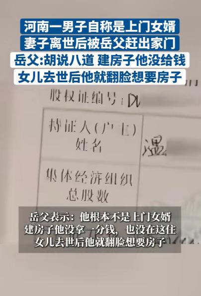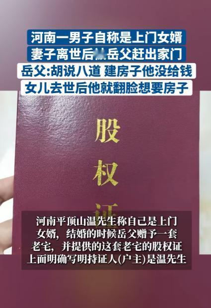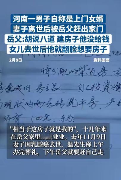 河南平顶山,42岁的温先生蹲在被焊死的铁门前,哭得浑身发抖。上午刚送走患乳腺癌离世的妻子,下午就被岳父和12岁的儿子赶出家门,连房门都被焊得严严实实。 河南,温先生还没从妻子逝去的悲痛中缓过神来,就被自己的岳父给赶出家门了,这下可把温先生给看傻眼了。 温先生说,自己和妻子携手走过了 17 个年头,当初结婚时,他以上门女婿的身份住进岳父家,岳父还把村里的一套老宅赠予他,手里的股权证上清楚写着他是户主,在他心里,这房子早就和自己绑在了一起。 这 17 年里,他一直把这里当成真正的家,对家里的大小事都尽心尽力,后来妻子查出乳腺癌,长达六年的抗癌路上,他几乎推掉了所有琐事,守在妻子身边端茶送水、跑医院做检查,哪怕知道治愈的希望越来越渺茫,也从来没有过半句怨言。 送走妻子的那一刻,温先生觉得心里空了一大块,浑浑噩噩地往家走,只想着摸摸家里熟悉的物件,缓解心里的剧痛。可他怎么也没料到,迎接他的不是家人的安慰,而是岳父冰冷的驱赶。 岳父态度强硬地让他离开,丝毫不顾念这 17 年的相处,也不管他刚经历丧妻之痛,看着被焊死的房门。 温先生彻底崩溃,他怎么都想不通,自己为这个家付出这么多,妻子刚走,他就被当成外人扫地出门,连最后一点念想都被剥夺。 他始终觉得,这套老宅是岳父当初赠予自己的,股权证就是最好的证明,自己理应拥有居住权,岳父这样的做法,实在让他难以接受。 面对温先生的控诉,岳父却给出了完全不同的说法,老人直言温先生的话全是不实之词,压根不是这么回事。 老人明确否认了温先生的上门女婿身份,还说当年家里盖这套房子的时候,温先生一分钱都没拿出来,一块砖都没搬过,从头到尾都没为建房出过力,所有费用都是自己和家人东拼西凑而来的。 而且这些年,温先生根本没在村里的老宅常住,在市区还有自己的房子,所谓被赶出门无家可归,和实际情况并不相符。 岳父还说,女儿在世的时候,彼此之间还算相安无事,可自从女儿被确诊重病,温先生的态度就慢慢变了。 等到女儿真正离世,温先生更是彻底翻了脸,第一时间不是好好料理后事、安抚家人,而是一门心思盯着这套老宅,想方设法要把房子占为己有。 自己刚承受丧女之痛,女儿尸骨未寒,女婿就忙着争房产,这让他既心寒又气愤,实在没办法接受,才会做出赶人、焊死房门的举动,也是为了避免温先生强行闯入闹事,保护家人的正常生活。 这件事闹开之后,村里也介入核实情况,村委工作人员给出了明确说法,这套老宅的产权属于老人,村两委也出具了相关证明。 温先生手里的股权证,并不能作为房子归属他的凭证,当初也没有赠予房产的相关约定,事情的关键,全都卡在了房产归属和双方各执一词的说法上。 原本在亲人离世的时候,一家人本该相互扶持、抚平伤痛,可这场突如其来的纠纷,让亲情变得脆弱不堪,所有的矛盾都集中在这套老宅上,双方各有各的理,各有各的委屈,谁也不肯退让。 温先生守在焊死的铁门前,迟迟不肯离开,心里满是不甘和痛苦,岳父守在门内,态度坚决,觉得自己的做法合情合理,不想再和温先生有牵扯。 随着事情被更多人知道,相关部门也介入协调,经过一段时间的调解之后,最终双方达成了一定程度上的和解与共识。 亲情从来都比利益更珍贵,伤痛面前,唯有相互体谅、彼此包容,才能抚平心底的裂痕,愿温先生能带着与妻子的回忆,慢慢走出悲痛,重拾生活的勇气。 愿这一家人能放下过往的隔阂,在往后的日子里,各自安好,不负曾经的相伴与付出,也不负离去之人的牵挂。 对于这件事,您有什么想说的吗?欢迎评论区留言讨论。 信源:荆楚网2026-02-09——《男子自称上门女婿,妻子离世后被岳父赶出家门。岳父:胡说八道,女儿去世后他就翻脸想要房子》