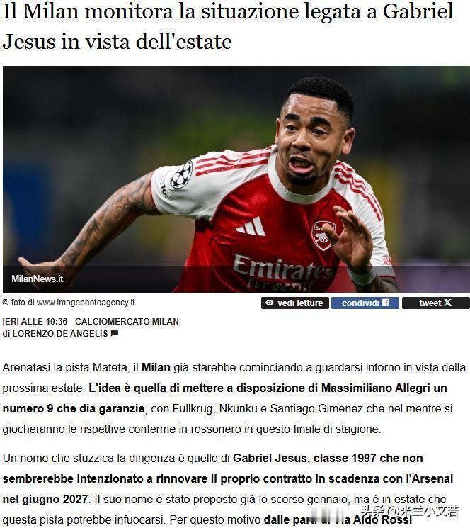 阿森纳前锋热苏斯!米兰关注阿森纳巴西前锋热苏斯,他一直都是米兰感兴趣的目标,他的名字最早在三年前就曾被提及,但转会传闻更有可能在夏季变得火热。因此,米兰方面正密切关注局势,等待任何可能让米兰介入的转机。 由于此前引进马特塔告吹,米兰已经开始为今年夏天物色新的锋线人选。俱乐部的设想是为阿莱格里提供一名能够提供稳定保障的9号位球员,米兰俱乐部认为热苏斯是合适的人选,同时阿莱格里也认为热苏斯是合适的人选。很奇怪,按照阿莱格里的打法我们觉得他应当需要攻城锤,马特塔是合适的人选,但阿莱格里并不喜欢马特塔,他更欣赏弗拉霍维奇与热苏斯这样的锋线球员。 与此同时,菲尔克鲁格和希门尼斯将在本赛季余下的比赛中,为了争取留在米兰的资格而战。据说米兰只会留下他们中的一人,现在的情况看菲尔克鲁格无论是在球员中还是球迷中都是呼声最高的人。