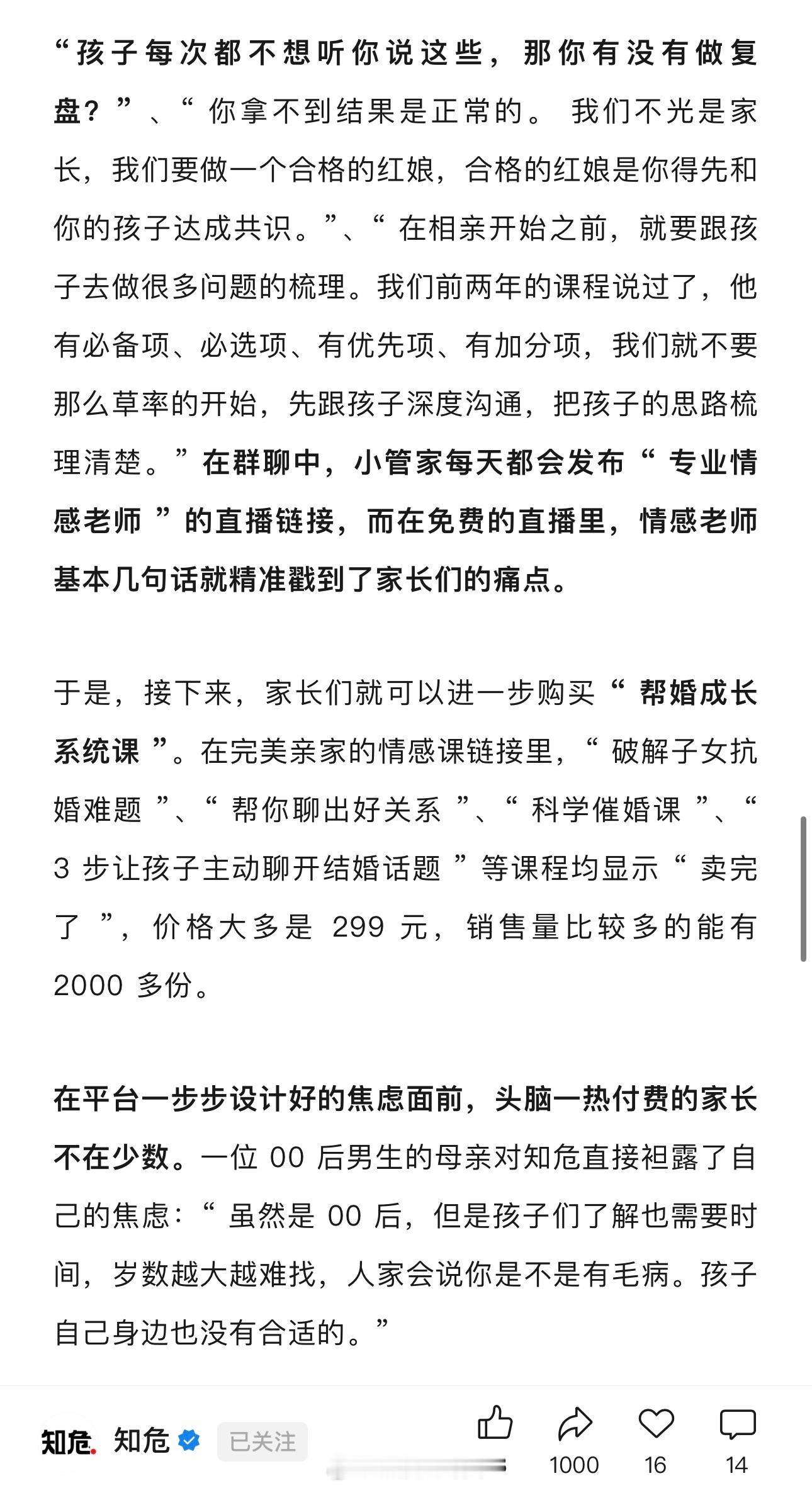 相亲软件盯上了年轻人的爸妈,现在都搞出“女婿直聘”了。科学催婚课直播大多是 299 元,销售量比较多的能有 2000 多份