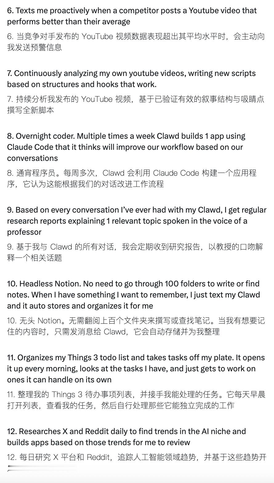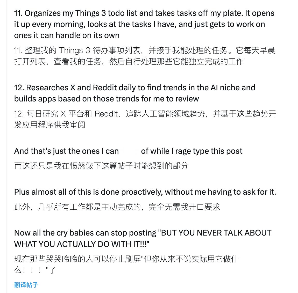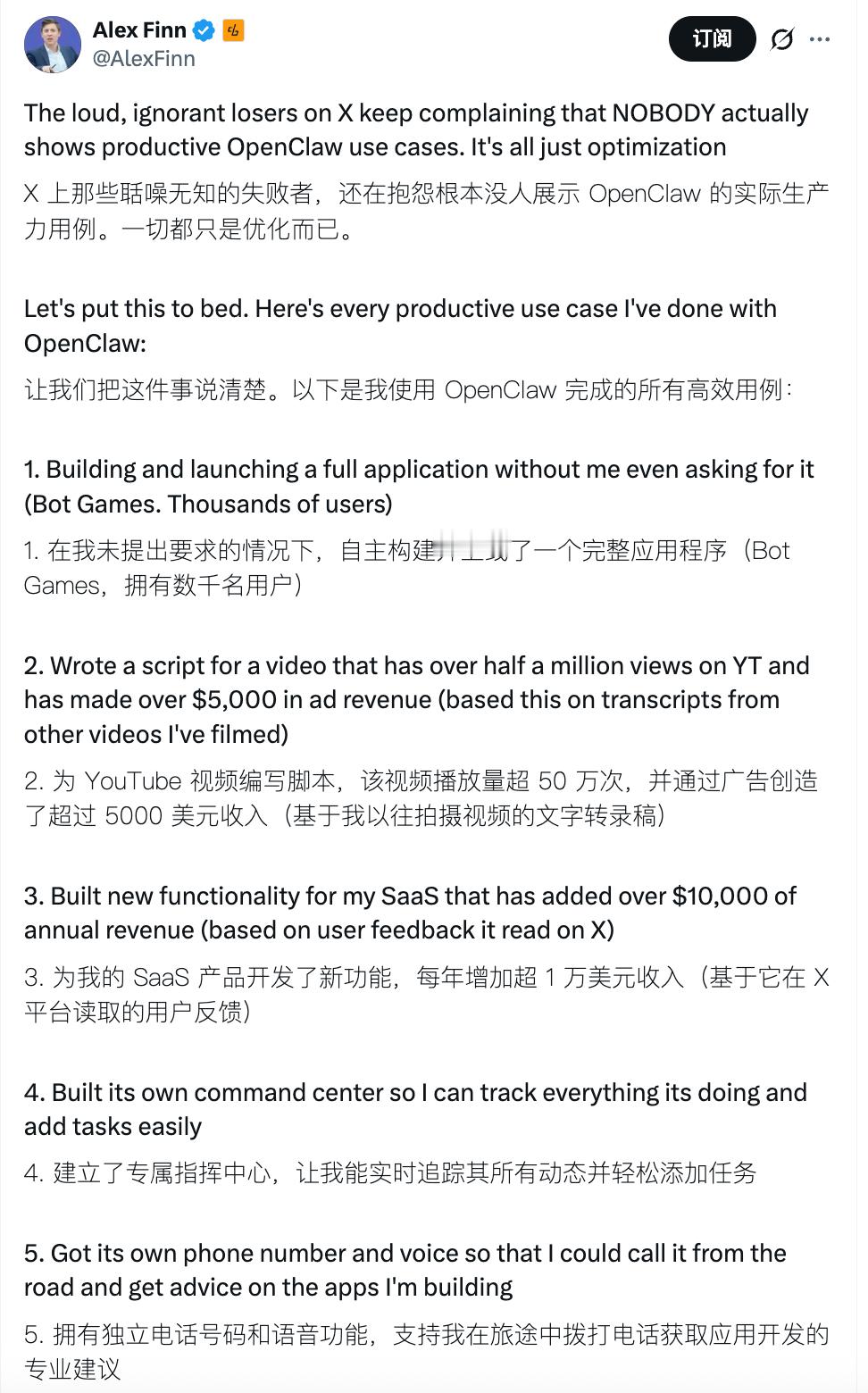 一类是生产力场景,但是这种场景还是需要挖掘探索,普通人离得有点远。例如这一波在 Openclaw 实践比较多的 Alex Finn,他就提供了一些思路。另外,哥飞前两天也分享了用 🦞 做站。
