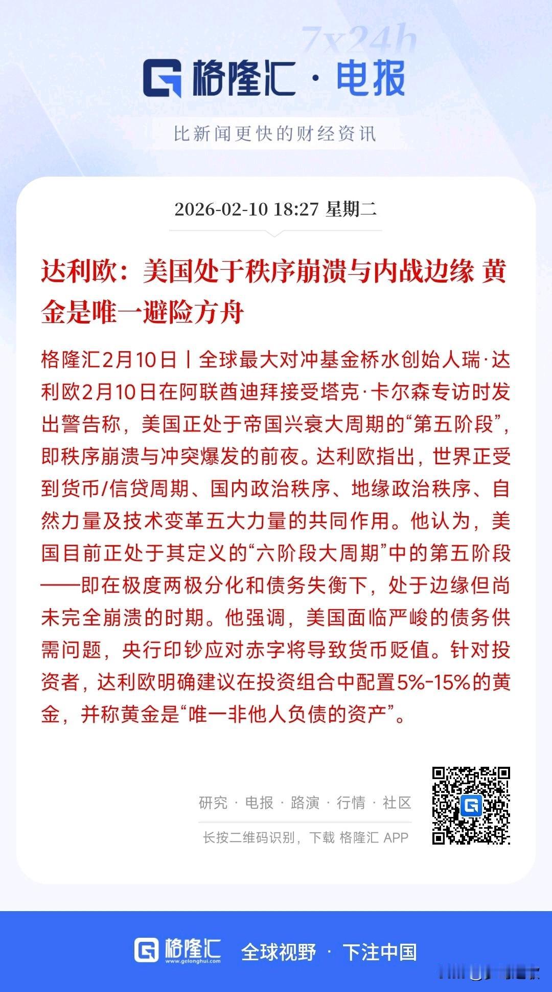 桥水基金力挺黄金,避险属性拉满 桥水基金创始人表示:现在美国经济正处于崩溃的边缘,唯一的避险资产就是黄金,其建议在投资组合里面配置5%-15%的黄金。 其实现在黄金依然是世界上最通用的货币,也是避险的品种。各国央行都在大量的增持黄金储备,而且现在地缘政治冲突增加了很多不确定性,说白了真打起来,纸币就是一张废纸,只有黄金是硬通货。 最近黄金一直在大跌,那是因为前期长得太多了,现在实在回归基本盘,回归之后可以预见的还是会涨的。