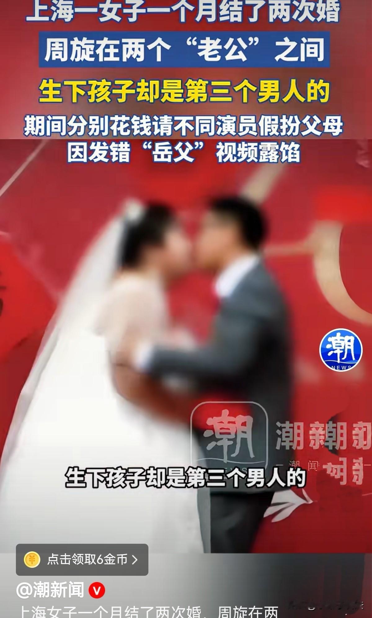短剧都不敢这么拍!上海,女子父母催婚,她便找了个同样被催婚的男子领了证,两人约定有名无实,各玩各的。婚后,女子继续网上聊人,并在一个月内同2个男人举办婚礼,一手编导,雇父母与家长见面,周旋在两人之间,还假借有孩子向他们索财,玩的不亦说乎。然而,两个男人各自都发现了异样,不约而同报警,让他们吃惊的是,孩子父亲竟是第三个男人! 2017年,林欢欢玩的正欢,却被家里催婚催得焦头烂额,不想被父母管束,又不想真的投入一段感情。 于是,她在网上随便找了同样被催婚的程伟。两人一拍即合,抱着“应付长辈、互不干涉”的心态,悄悄领了结婚证,成了法律上真正的夫妻。 这段有名无实的婚姻,给了林欢欢自由,却也让她越发渴望一段看似正常、能满足虚荣心的恋爱。 没过多久,她便厌倦了这种空壳婚姻,开始在网络上寻找新的感情寄托。 2021年,林欢欢在网上认识了在北京打拼的山东小伙赵鑫。 赵鑫踏实真诚,一见到温柔漂亮的上海姑娘林欢欢,就彻底动了心。 为了这段异地恋,他毅然辞掉北京的工作,只身搬到上海找了份工作,可两人不在一个区,只能周末见面,他也乐此不疲,对未来充满希望。 可他不知道,自己只是林欢欢鱼塘里的一条鱼。 交往没多久,林欢欢突然告诉赵鑫自己怀孕了。 这个消息让赵鑫又惊又喜,立刻把老家父母接来商量婚事,两家人见面顺利,国庆就在山东办了热热闹闹的婚礼。 林欢欢没让亲生父母到场,只带了一个朋友,赵鑫一家人虽有疑惑,却也没多想。 婚后赵鑫怕孩子出生影响上户口,一次次提出领证,林欢欢咋可能与他领证呢,一领证不就露馅了吗! 于是她找借口推脱,说自己是失信人员,领证会连累他,还谎称单身女性也能办出生证明。赵鑫很信她,便一次次妥协,丝毫没察觉不对劲。 与赵鑫办完婚礼没多久,林欢欢又在网上认识了浙江开民宿的李文龙。 2021年6月,两人相识相恋,虽李文龙比林欢欢大十几岁,但经济条件更好,对她更是出手阔绰,不仅租下别墅让她住,父母见面时还直接给了8万8的彩礼。 林欢欢看准了李文龙的真诚与家境,干脆把重心转移到他身上,借着赵鑫出差的机会,直接向赵鑫提出分手,转头就和李文龙在浙江办了婚礼。 林欢欢一个月间游走在两个男人之间,竟举行了2次婚礼,自编自导,甚至雇演员,还假借孩子,仍牵扯着赵鑫。 林欢欢的亲生父母知道她早已结婚,不知后来她同时交往两个男人的事,不可能出面见家长。 于是,她花3000元雇演员假扮父母,见赵鑫家人用一批演员,见李文龙家人又换一批,每次演完,她都会短暂沉浸在“家庭和睦”的假象里,觉得那一刻格外温馨。 可她没想到,正是这些临时演员,成了戳破骗局的关键。 婚礼过后,李文龙因与民宿合伙人产生矛盾回到浙江,两人开始分居。 为了稳住李文龙,林欢欢不断发孩子的视频给他,可视频里逗孩子的男声,和他见过的“岳父”声音完全不同,疑心顿生的李文龙,越想越觉得不对劲。 原来林欢欢也整懵了,竟然把发给赵鑫的视频发给了李文龙。 另一边,被分手的赵鑫也渐渐发现了破绽。林欢欢告诉他,分手后自己生下了一个儿子,可当她带孩子和赵鑫见面时,怀里抱的却是个女儿。 赵鑫起初只以为孩子长得小、年龄对不上,直到后续种种反常细节堆叠,他才意识到,自己从一开始就掉进了谎言里。 两人不约而同报警!民警介入调查后。 更让两人觉得惊讶、讽刺的是,林欢欢口中的这个孩子,既不是赵鑫的,也不是李文龙的,而是她和合法丈夫程伟在2023年生下的女儿。 原来,当年她对赵鑫谎称怀孕,根本是子虚乌有。她曾和赵鑫同居时有过流产,却故意隐瞒,直接下载别人的孕检单造假,用一个不存在的孩子,拴住赵鑫的感情与付出。 而在两段虚假婚姻里,她不断隐瞒已婚事实,虚构怀孕、编造理由,利用两个男人的愧疚与爱意,一次次索要财物,把诈骗当成了理所当然。 直到东窗事发,林欢欢依旧没有意识到问题的严重性,她轻描淡写地觉得,自己不过是搞了几段婚外情,算不上大错。 可在赵鑫和李文龙眼里,这场骗局耗尽了他们的感情、金钱与信任,赵鑫更是直言,这是他人生最黑暗的时刻,永远无法原谅。 《刑法》第266条规定:诈骗公私财物数额较大的,处以3年以下有期徒刑、拘役或管制,并处或单处罚金;数额巨大或存在其他严重情节的,处以3年以上10年以下有期徒刑,并处罚金… 警方与检察官介入后明确,林欢欢隐瞒已婚事实,以婚恋、结婚为幌子,让两名受害人基于错误认知主动交付财物,已经符合诈骗罪的构成要件。 而她雇佣的演员是否构成共犯,也要看是否知情、是否参与共谋。 (文中人物为化名) 您对林欢欢的行为怎么看?