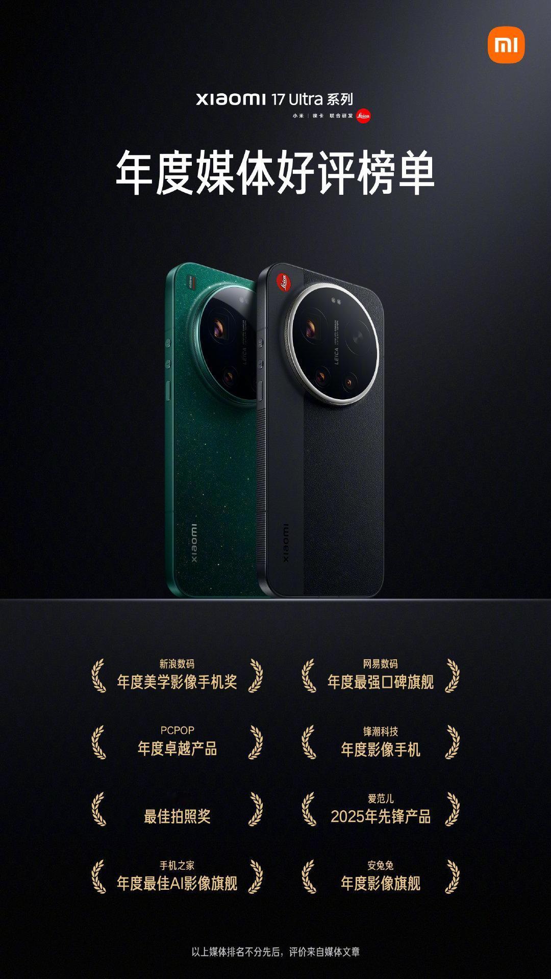 看看小米17 ultra获得的各种奖项,年度美学影像手机、年度最强口碑旗舰、年度卓越产品、年度影像手机、最佳拍照奖、2025先锋产品、年度最佳ai影像旗舰、年度影像旗舰,一共八大奖项,产品影响力绝绝子。要说最大的遗憾,缺一个背屏算不算…