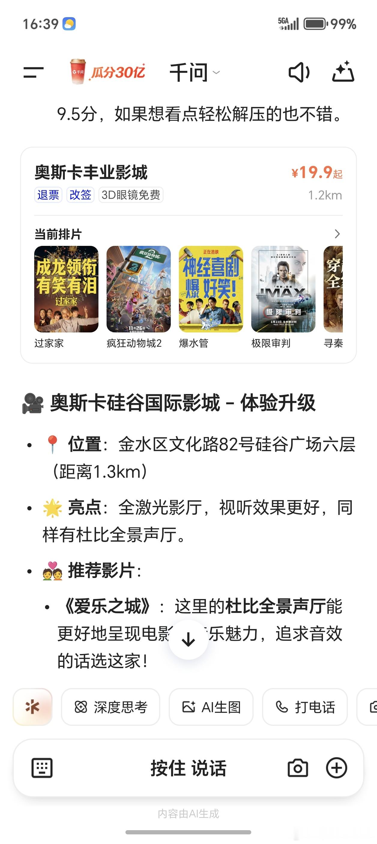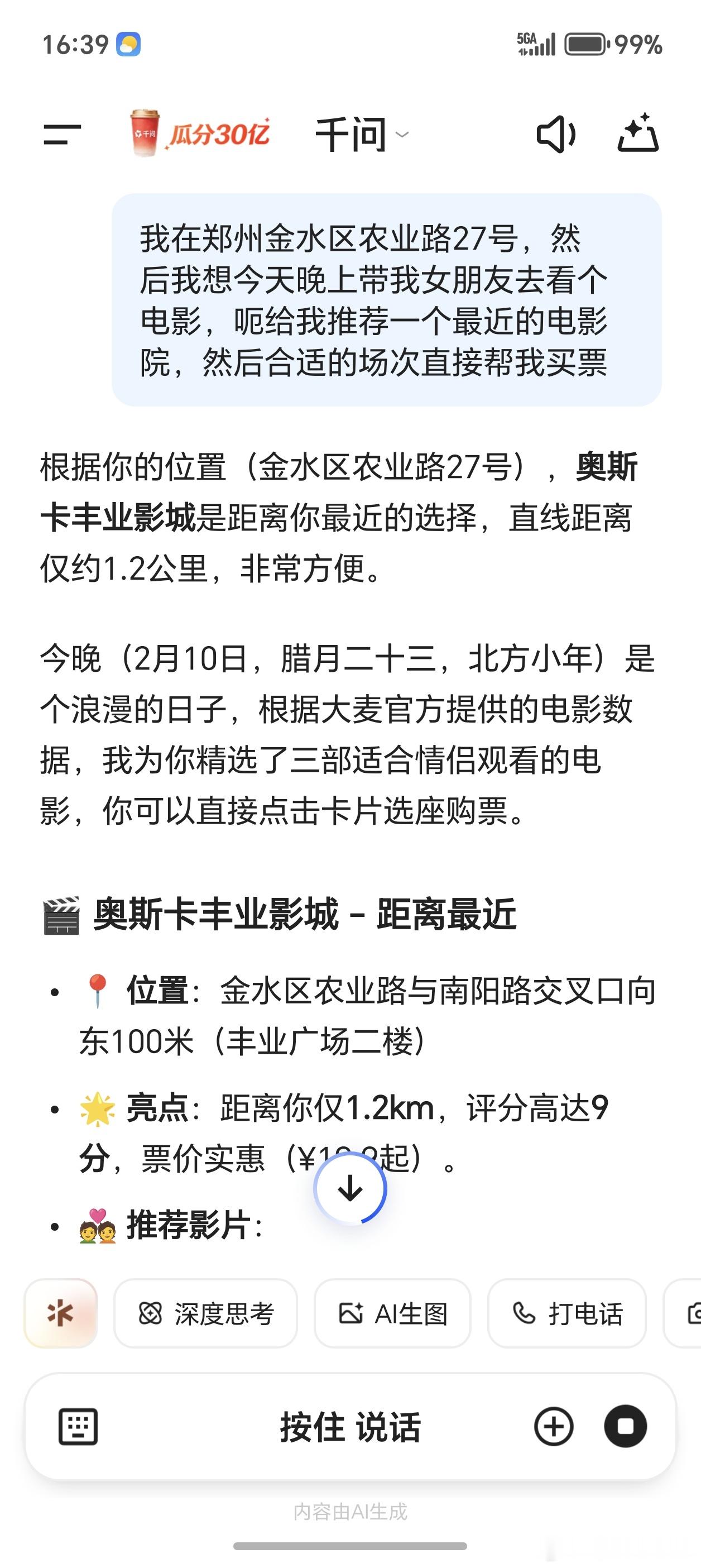 千问接入大麦千问测试AI买电影票能力 你知道吗?千问APP接入大麦,现在只要打开APP,一句话就能完成从选片到出票的全流程,省去频繁切换应用的麻烦。技术不就应该这样吗?不张扬,却妥帖。或许下次朋友还在手忙脚乱找攻略时,你已经买好票,悠哉地等着开场了。