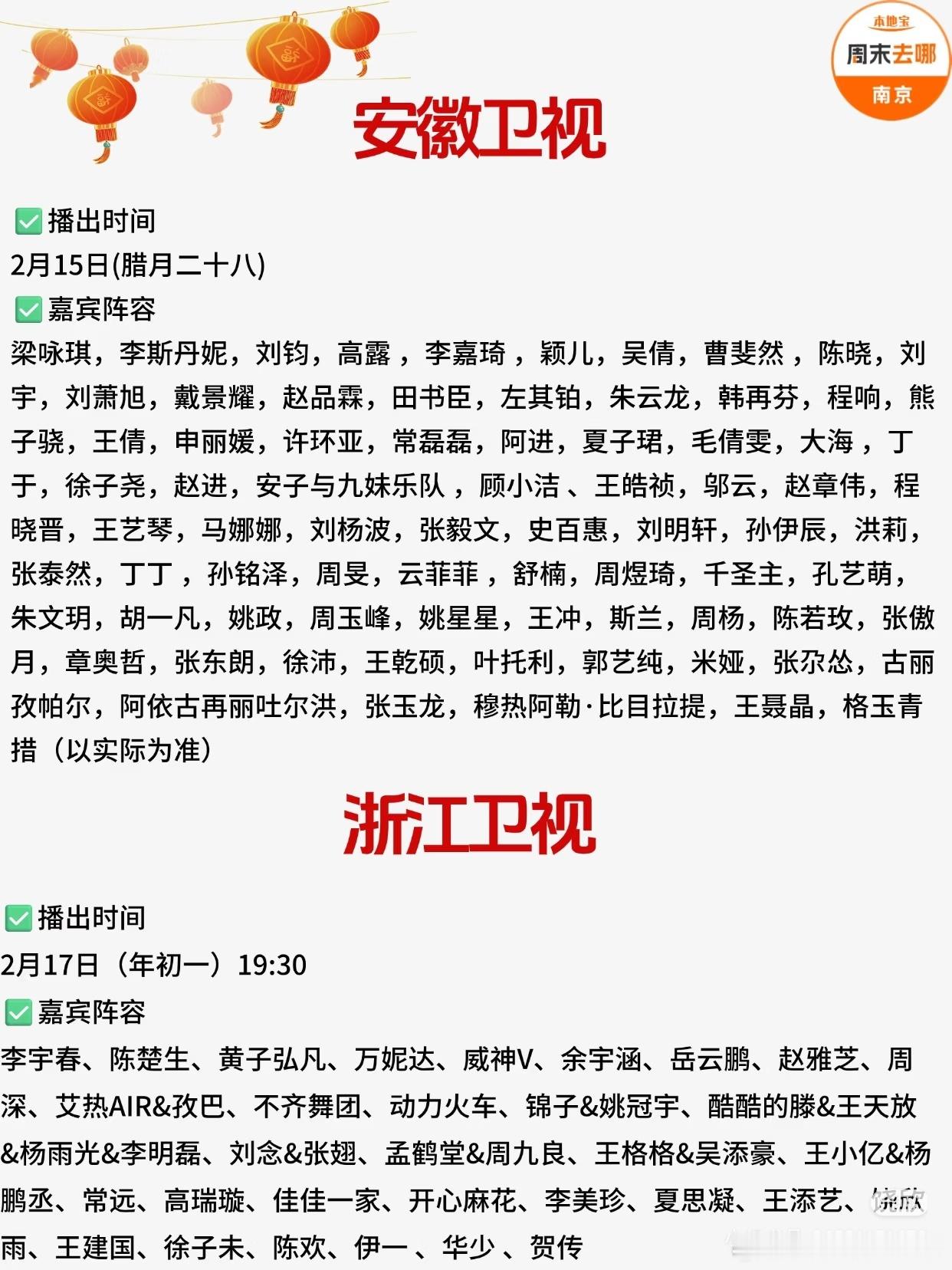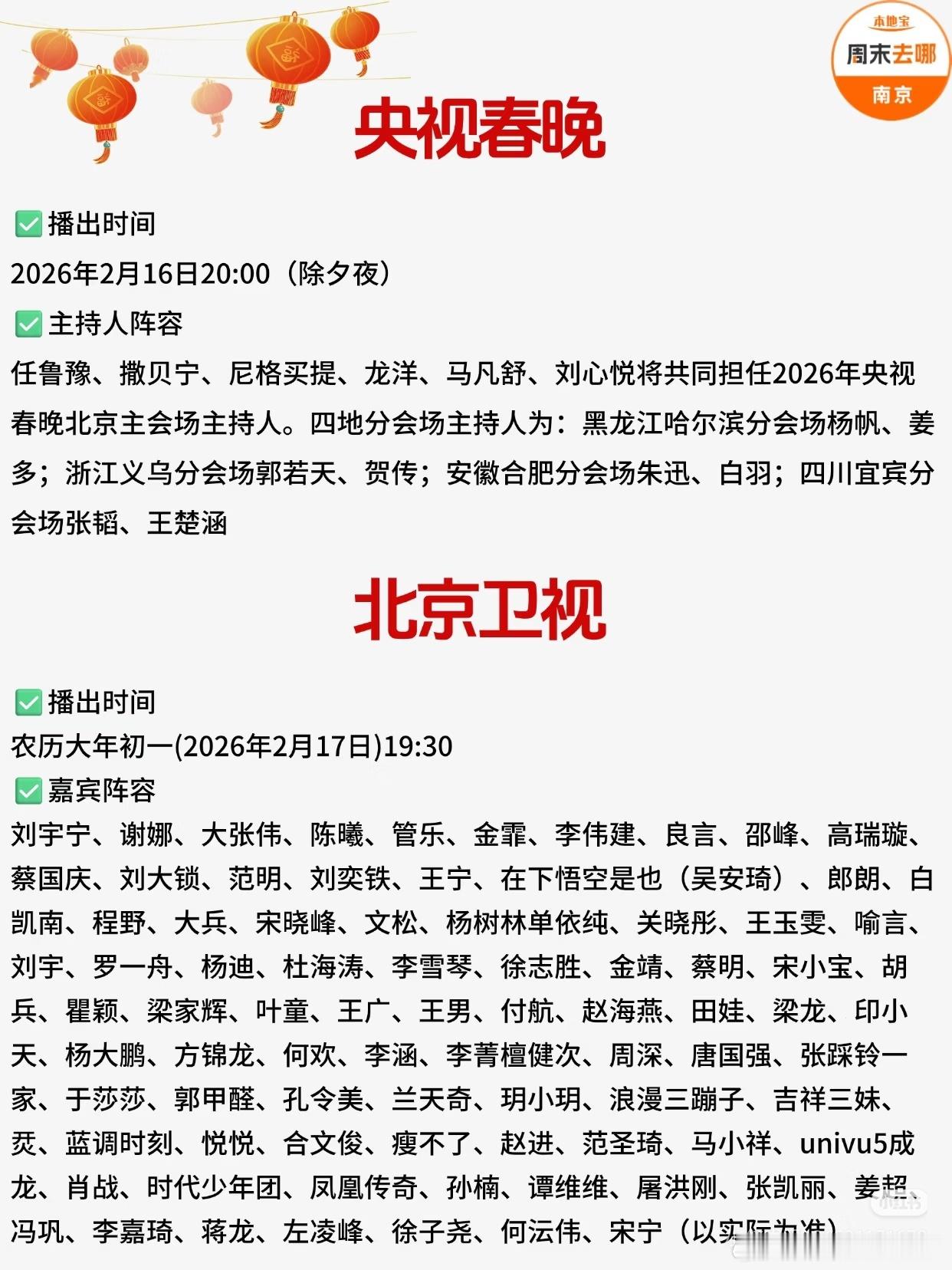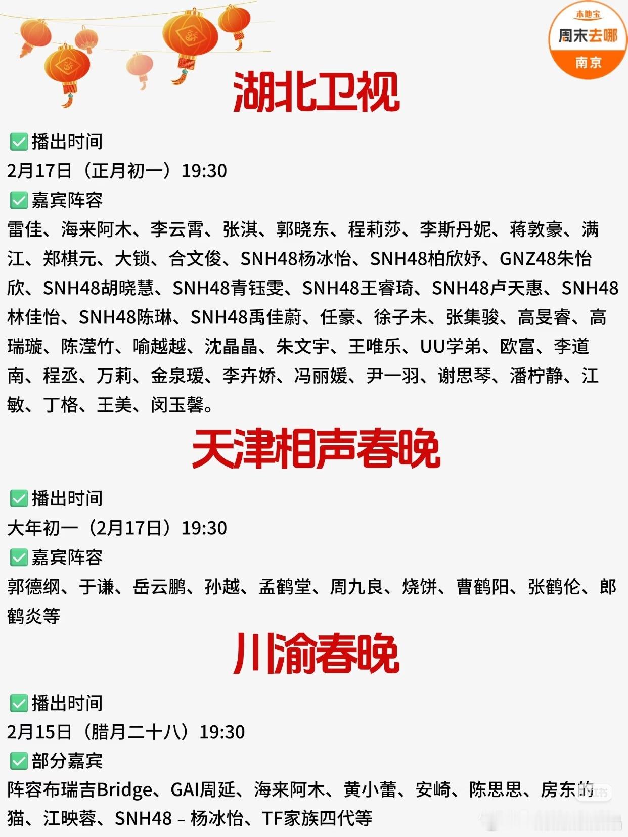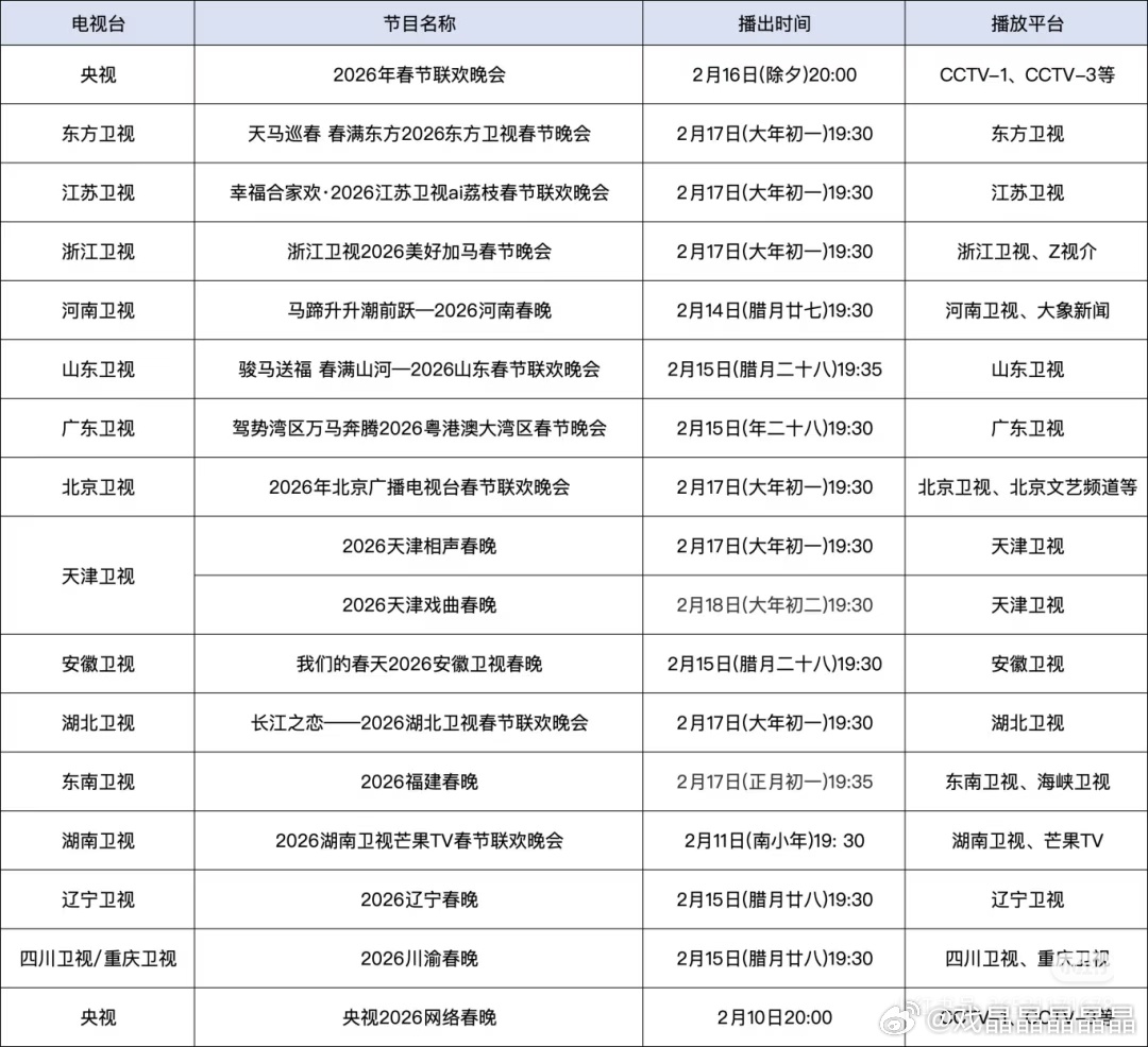 2026各大卫视春晚播出时间+阵容汇总!包括:央视春晚、北京卫视、江苏卫视、东方卫视、湖南卫视、广东卫视、安徽卫视、浙江卫视、河南卫视、山东卫视、东南卫视、辽宁卫视、湖北卫视等。