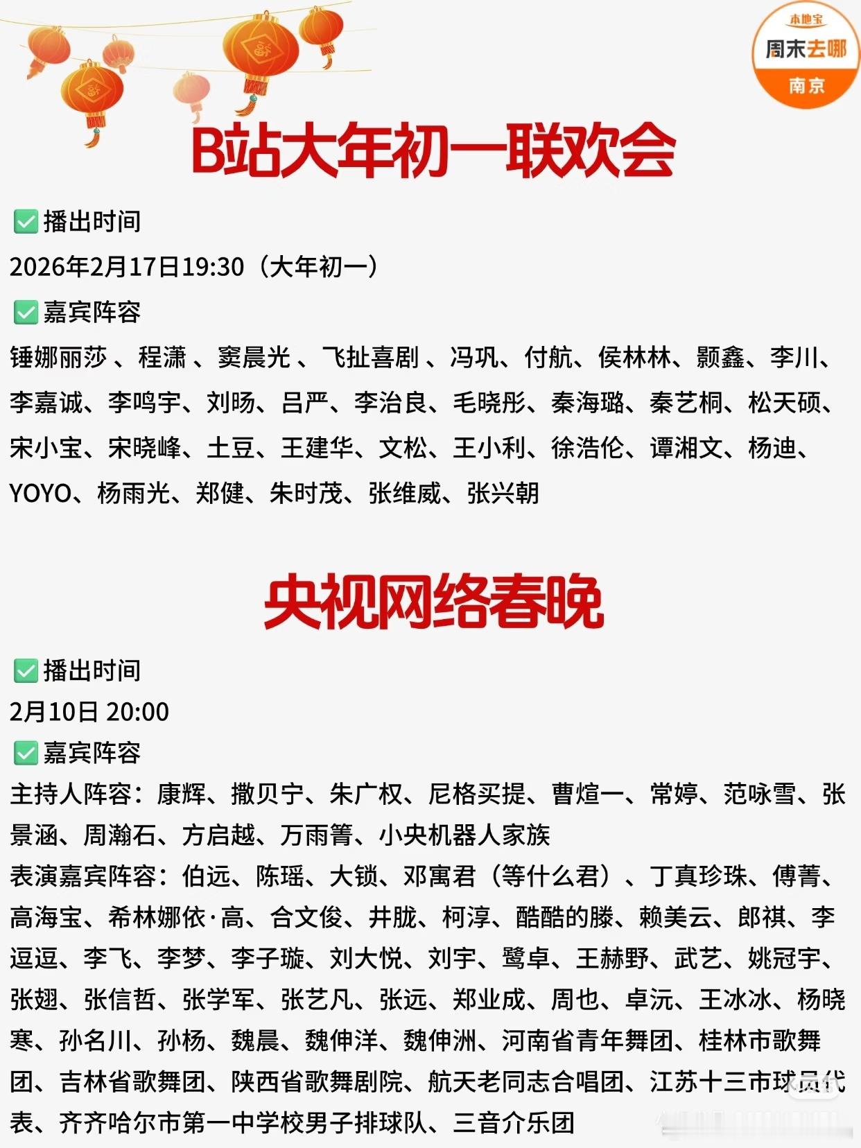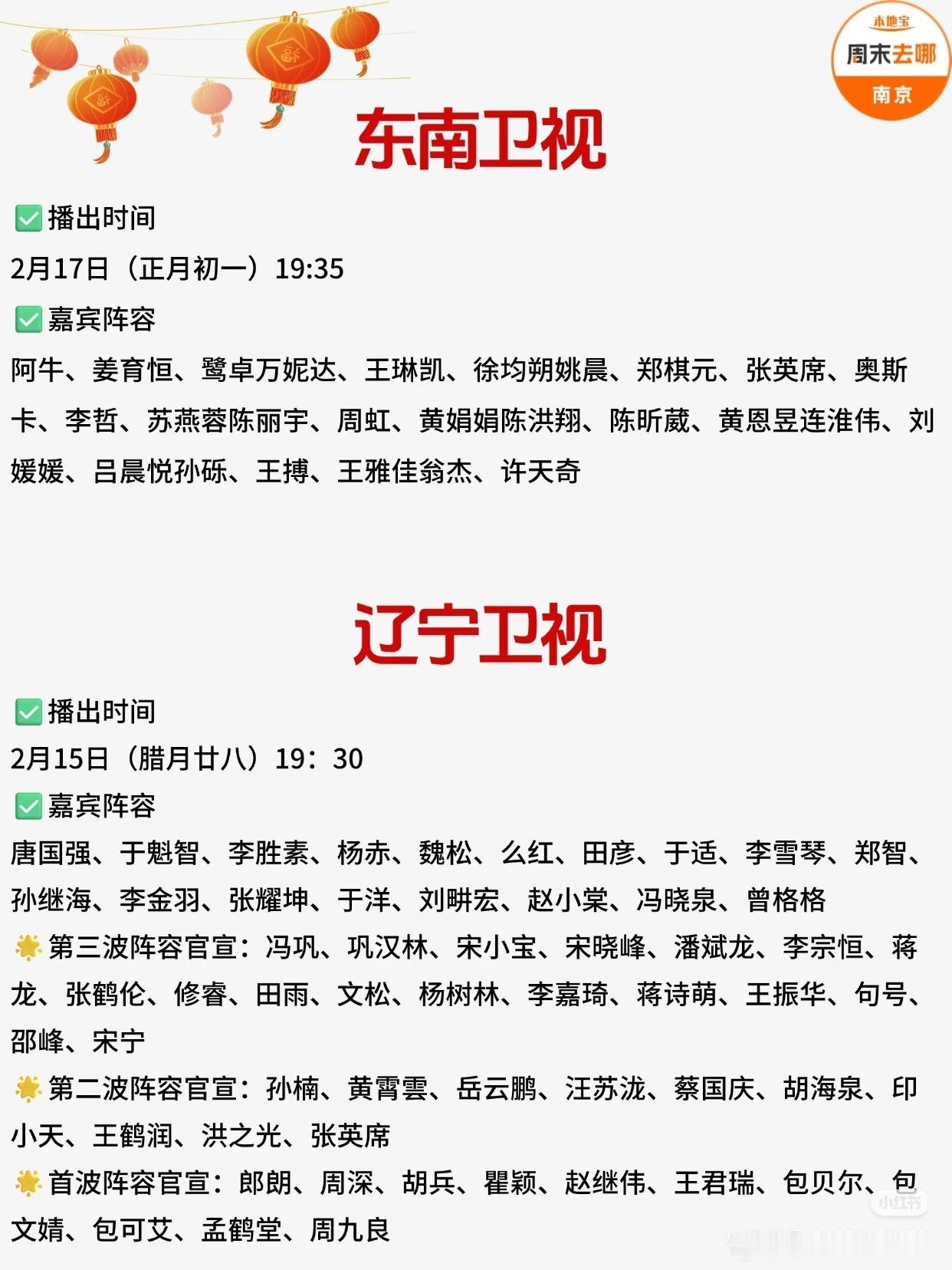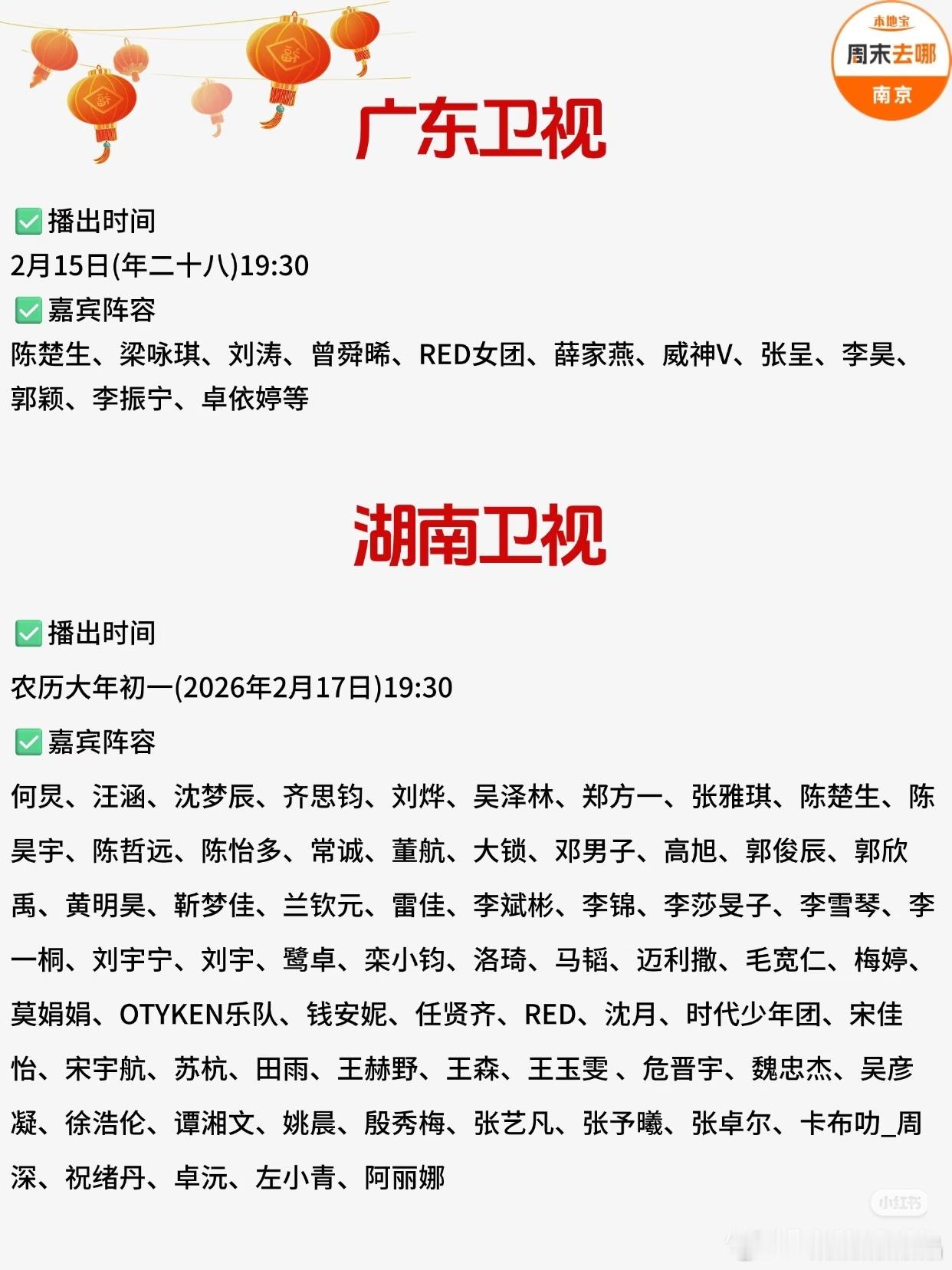 2026各大卫视春晚播出时间+阵容汇总!包括:央视春晚、北京卫视、江苏卫视、东方卫视、湖南卫视、广东卫视、安徽卫视、浙江卫视、河南卫视、山东卫视、东南卫视、辽宁卫视、湖北卫视等。