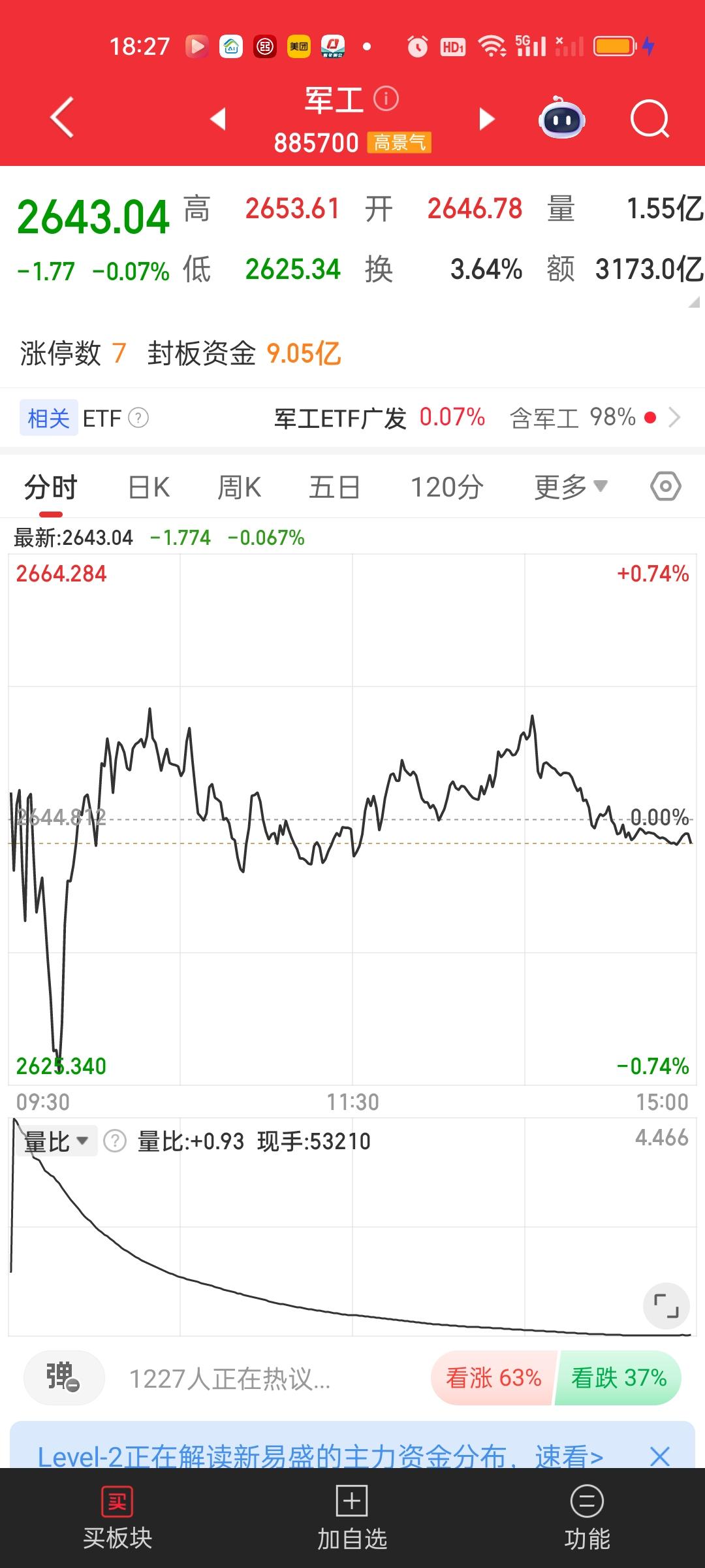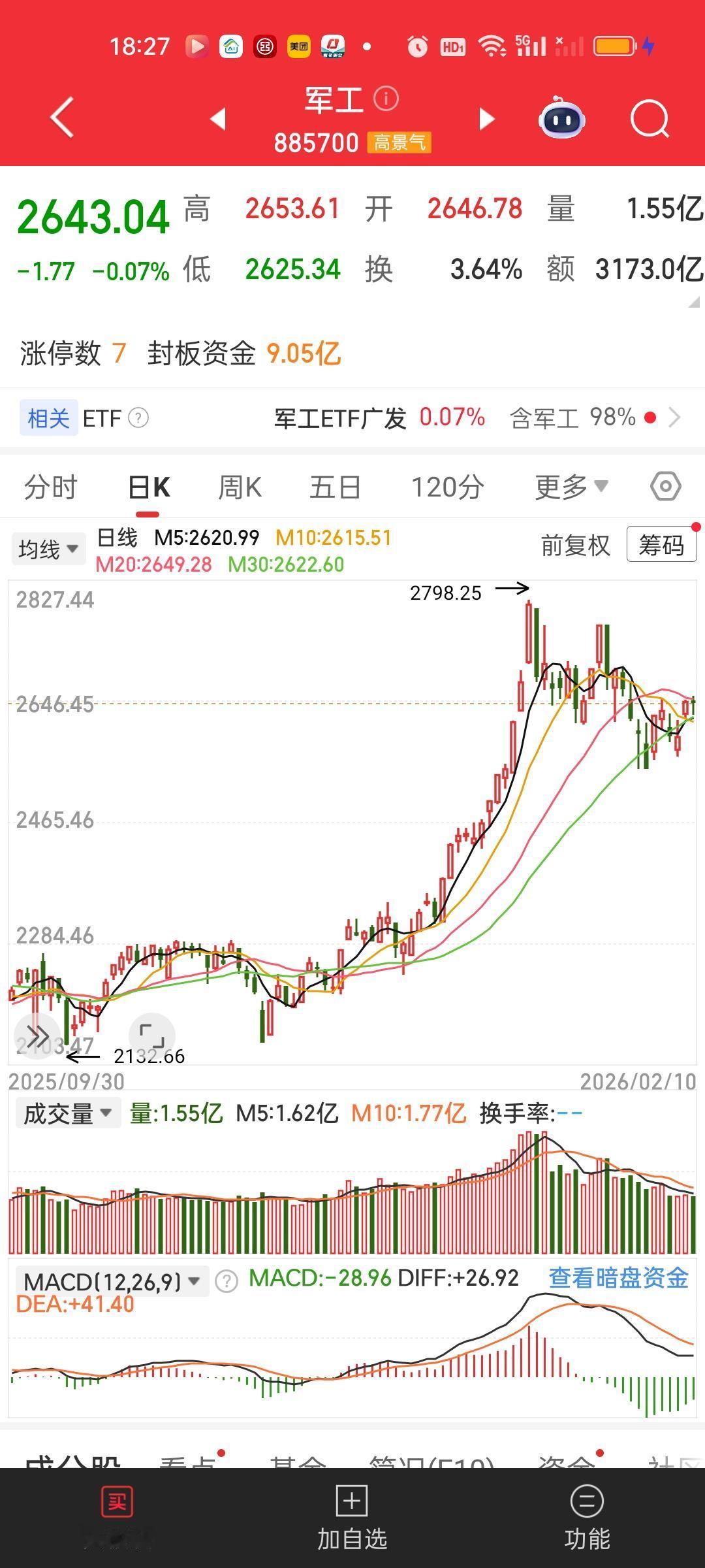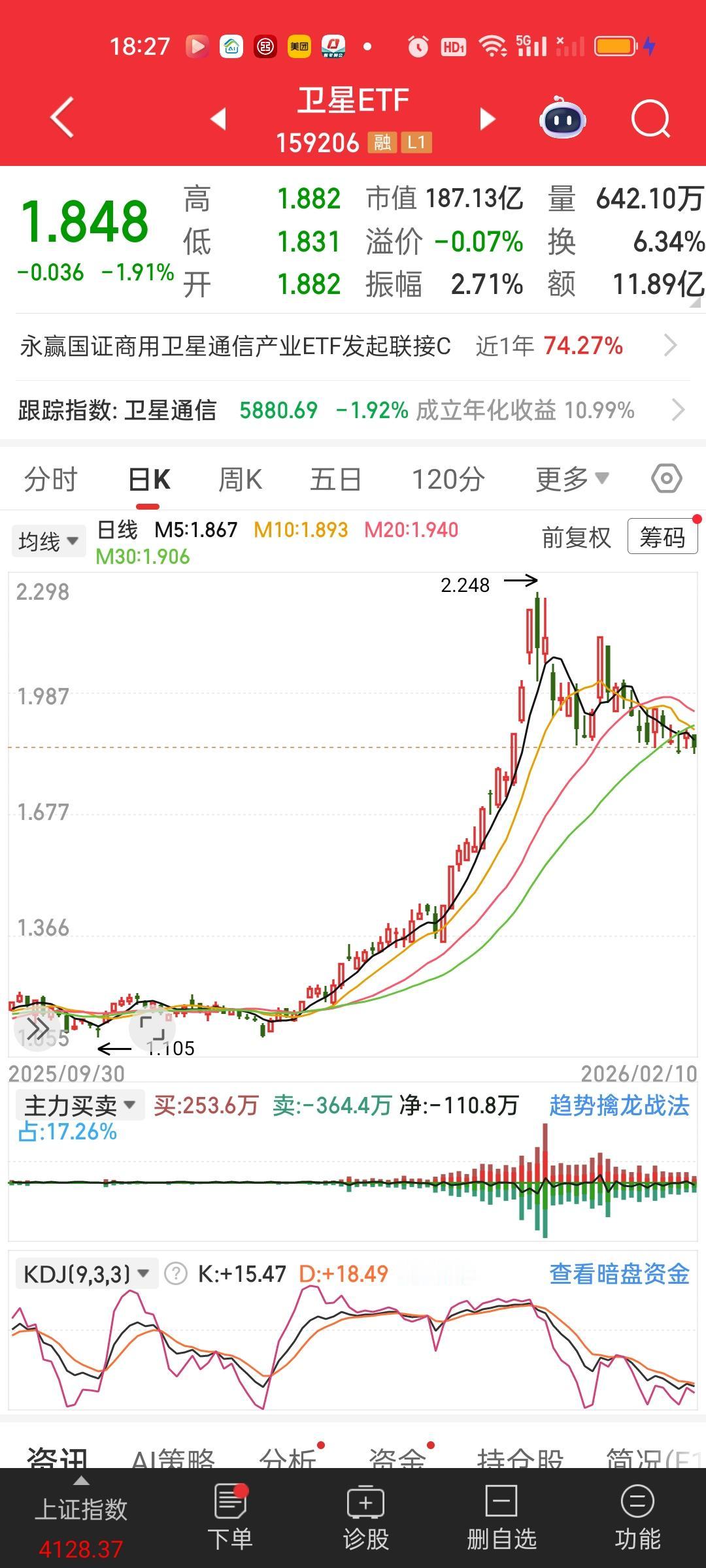 商业航天的走势还是和军工很像。两个板块都是在20日线下方,在其它所有均线的上方。这里还是不能判断为要走下行趋势,需要继续观察。理论上讲前面在短时间内涨幅过大需要更长时间来消化。1月12日见顶的,就算调整到3月12日,4月12日也是很正常的。但坚定相信调整以后的第二波必破前高。商业航天的场内叫做卫星ETF,目前依旧在所有均线的下方,暂时还走的比较弱。