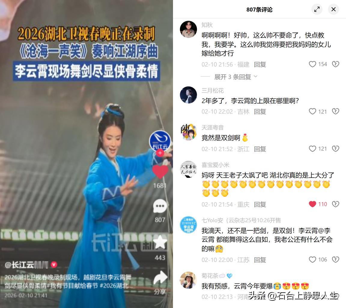 李云霄春晚双剑舞,飒到出圈 湖北卫视春晚上,她和张淇跨界合作《沧海一声笑》,双手执剑的侠女范儿,把观众看呆了。大家都在惊叹:这姑娘还有什么不会? 这哪是什么天赋开挂,是20年戏曲基本功磨出来的。13岁学越剧,先攻小生再转花旦,为了塑造穆桂英这类角色,跟着吕派名师抠水袖里的刀马旦劲道,还自费反复调试戏服找刚柔平衡。 如今娱乐圈总爱靠短平快噱头博流量,但观众心里门儿清,那些看似突如其来的惊艳,全是台下日复一日的沉潜。比起追问她的上限在哪,不如说,这种把十年功刻进骨子里的专业,本身就是流量时代的稀缺品。 毕竟,能真正让人记住的,从来都不是速成的花架子。