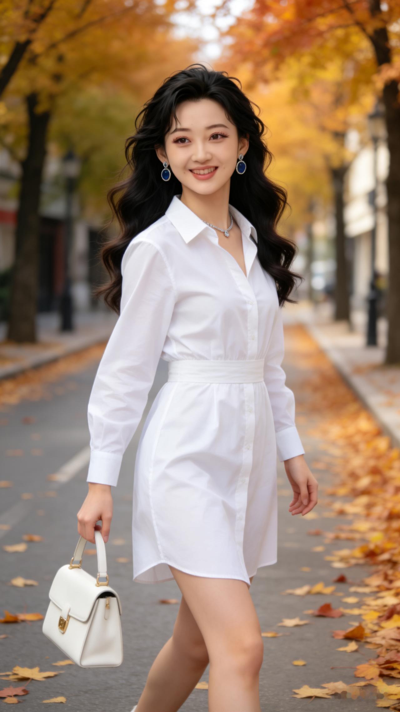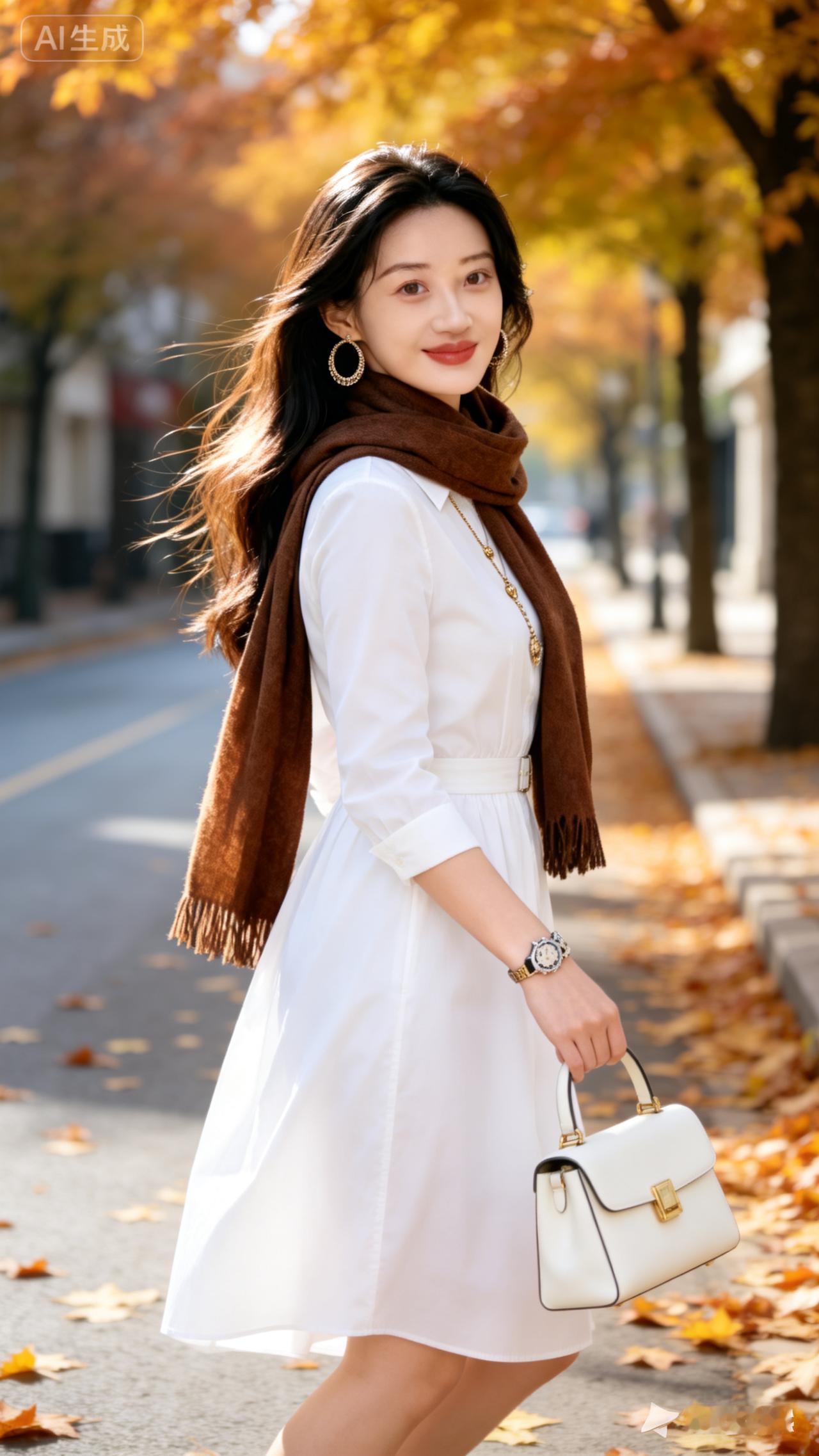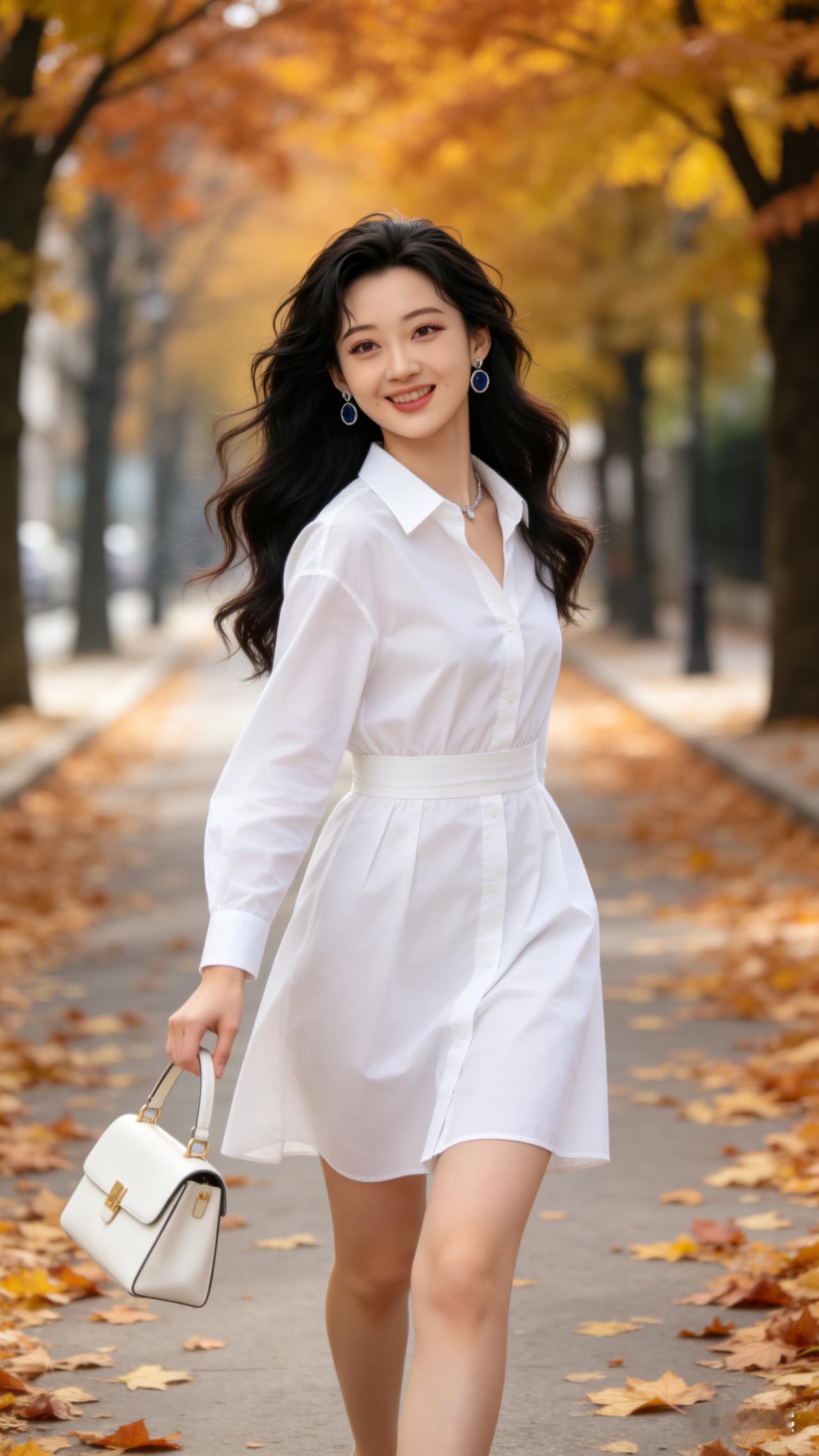 秋日漫步,白色连衣裙与落叶的浪漫邂逅🍂👗💃