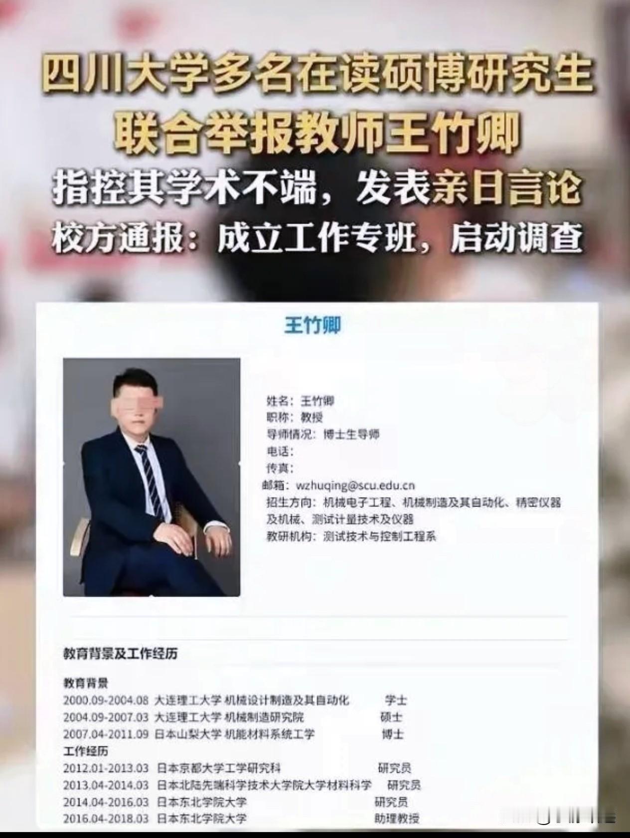 川大这事儿真是让人开了眼,28个学生被逼得没办法,整整搞了83页举报信才敢站出来说话。 四川大学博士生导师被28名学生举报,涉贪污,卖国罪! 28名学生联合举报该博导,举报信长达83页,内容非常详细! 光录音就有97段,凭证更是236张! 从学生们如此详实的举报材料来看,这博导的问题大概率是板上钉钉。 他不仅背叛国家利益,还对学生如此压榨,实在是师德败坏到极点。 该博导与日本有诸多牵扯,拿着国内补贴却把钱转去日本,这行为严重损害了国家利益。 而他对学生的种种恶行,也寒了学生们的心。 四川大学虽成立调查组且查封办公室,但博导仍保留职位,这让学生们的公道迟迟难讨。 这样的处理方式难免让人质疑调查的力度和决心。 如今社会对学术腐败和师德问题极为关注,希望四川大学能彻查此事,给学生和社会一个公正的交代,绝不能让这种害群之马继续逍遥。 中日博弈,拼的从来都是实力和底气! 中国大市场的底气摆在这,日方逆势硬脱钩,最终只会反噬自身。 咱们稳扎稳打,把发展主动权握在手里,谁能笑到最后一目了然~ 你觉得日方这番操作是不是搬起石头砸自己的脚? 评论区聊聊看法!