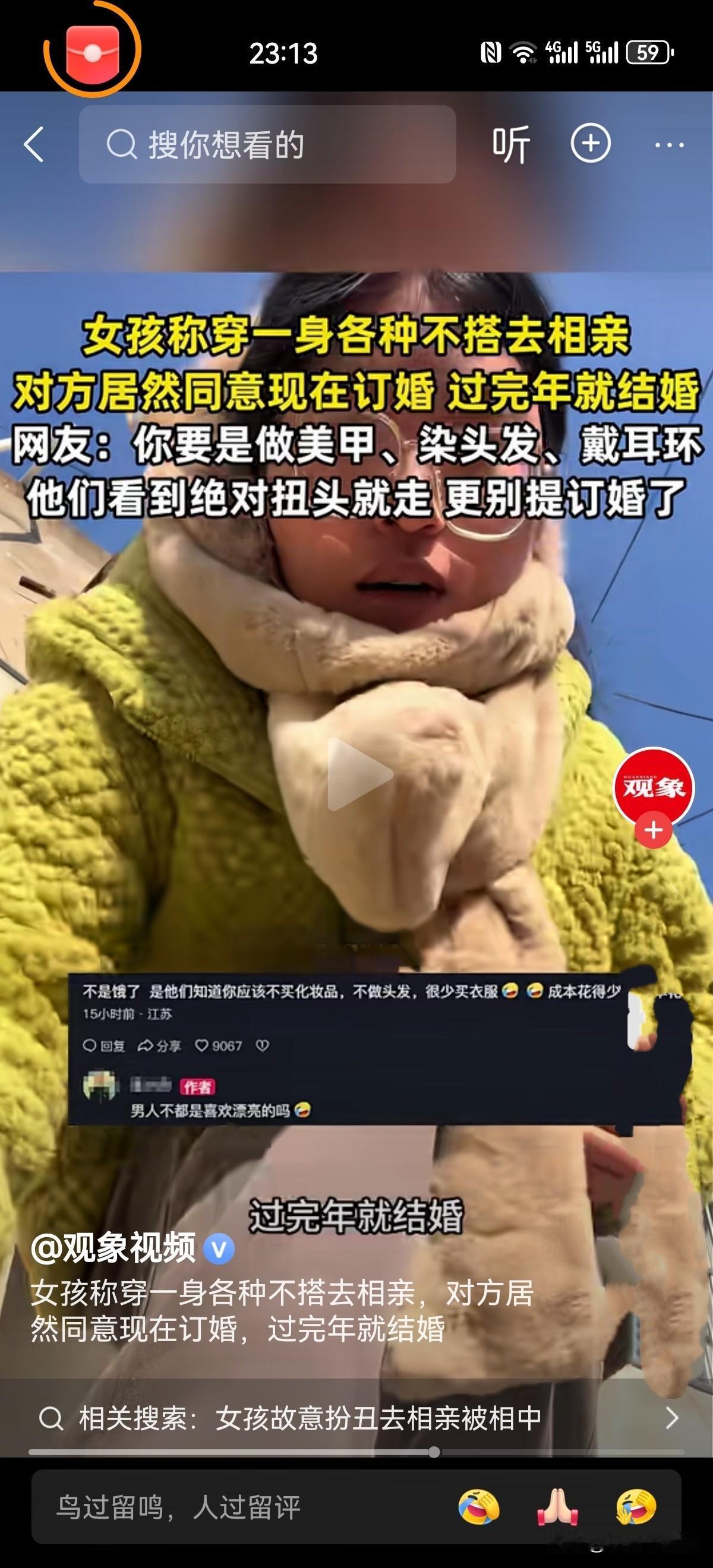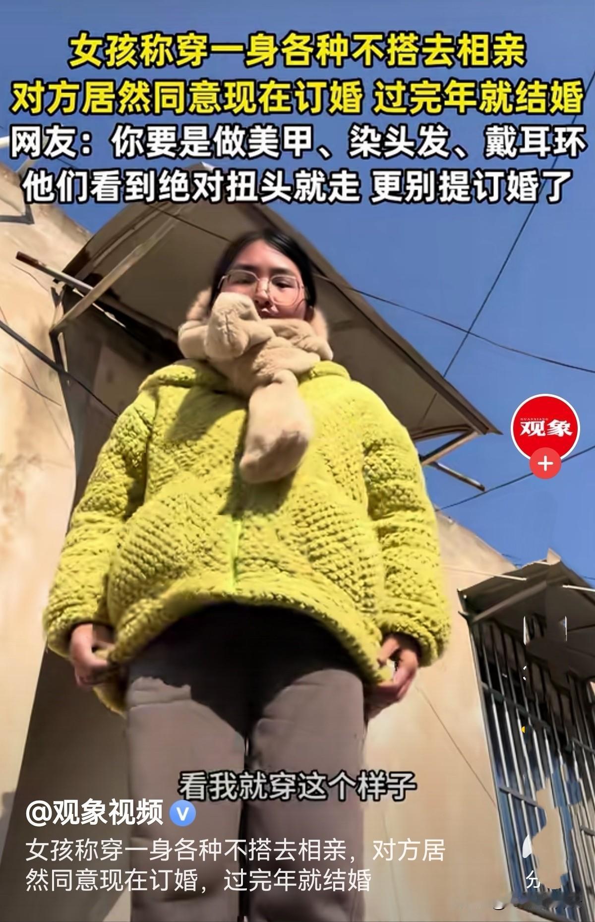 “是饥不择食吗?”安徽,女子对父母安排相亲排斥,却有不想忤逆父母,便胡乱搭配穿着,故意扮土扮丑去相亲,本想吓跑对方,谁知对方一看她眼睛竟亮了,竟要立刻订婚,年后结婚!女子直言:有的男的真的是太饿了吗?网友:丑妻近地家中宝! 年前这会,是相亲的旺季,女子也被父母催婚搞得一个头两个大,可她对相亲这事非常反感排斥,压根不想顺着家人的意思来。 可她又不能忤逆父母,思来想去,她想出了一个办法,把自己打扮得越土越难看,最好能直接把相亲男吓跑,这样以后家里人就不会再逼着她相亲了。 女子本身皮肤偏黑,长相也属于丢在人群里不起眼的类型,平日里稍微收拾下还能看,可这次她偏要反着来。 出门前,她把头发随便往脑后一扎,乱糟糟的毫无造型,又翻出自己最嫌弃的一副大黑框眼镜,厚厚的镜片架在脸上,土气感瞬间拉满。 脸上更是一点妆容都没有,素面朝天的样子,让本就普通的长相显得更加平淡。 她还嫌不够,又找出一条毛绒围巾,幼稚的款式和颜色,被她胡乱绕在脖子上打了个结。身上套了件老气的黄绿色厚棉衣,下身搭配一条卡其色棉裤,全身颜色乱七八糟,完全不搭,整个人被裹得像个严实的粽子。 站在镜子前,看着自己这副又土又敷衍的模样,女生心里乐开了花,信心满满地觉得,这次相亲绝对能以失败告终,甚至已脑补出男生全程黑脸、随后拉黑她的画面。 可让她万万没想到的是,见面之后,剧情完全偏离了她的预想。 相亲男生看到她,非但没有嫌弃,反而眼前一亮,全程侃侃而谈,对她表现出极大的兴趣。 男生事无巨细地追问,恨不得一下子摸清她的所有情况,看那股热情劲儿,女生当场就懵了! 她怎么也想不通,自己都把自己折腾成这样,甚至有点邋遢,怎么还能被对方看上? 更让她震惊的还在后面,相亲结束后,男生直接主动表态,说觉得两人特别合适,提议现在就订婚,等过完年立马结婚。 这个提议来得太过突然,这让她又诧异又觉得离谱。 回家的路上,女生越想越不对劲,她从不相信什么一见钟情,更不觉得自己这副打扮能让人一见倾心,这场敷衍到极致的相亲,怎么会换来对方如此急切的求婚? 有的男生是真的饿了?不管女生打扮成什么样,只要是个女的,他们都能接受? 女子将这件事分享到网上后,网友们的评论却让她瞬间清醒。 大家纷纷表示,这些男生不是“饿”,而是太聪明了。 有人说:要是女生打扮得精致漂亮,做着美甲、染着头发、戴着耳环,穿着时尚的衣服去相亲,这些男生大概率会扭头就走,更别说提订婚的事。 在这些男生眼里,女生不打扮、穿着朴素,代表着会过日子、接地气,娶回家能安心顾家、操持家务,不用费心费力去供养,是最适合结婚的人选。 他们很清楚自己养不起精致的“白天鹅”,所以才会格外青睐朴素低调的女生。 还有人这样 说:他是觉得好用,实惠,不打扮更省钱,并不是真爱你这个人,就是骗你回家做保姆的!性价比高! 而女子之所以会用这样极端的方式逃避相亲,归根结底还是被家人催婚逼得太紧。 《民法典》第1046条规定:结婚应当男女双方完全自愿,禁止任何一方对另一方加以强迫,禁止任何组织或者个人加以干涉。 女子不用迎合父母和别人的想法,任何人都不可以干涉她的婚姻,她可以拒绝去相亲,她可以按照自己的方式选择合适自己的丈夫。 她完全没必要为了满足家人的期待委屈自己,更不用被这场荒唐的相亲打乱节奏,按照自己的心意生活,才是最舒服的状态。 这场啼笑皆非的相亲,不仅戳破了部分男生急于结婚的真实心态,也让女生明白,婚姻从来不是将就,更不能被外界的声音裹挟,忠于自己的感受,才是对自己最好的负责。 女人就该爱自己,活出自己,不要成为别人的附属品!无丑女人只有懒女人,打扮下都是大美女! 您对现在男孩选媳妇的标准怎么看?