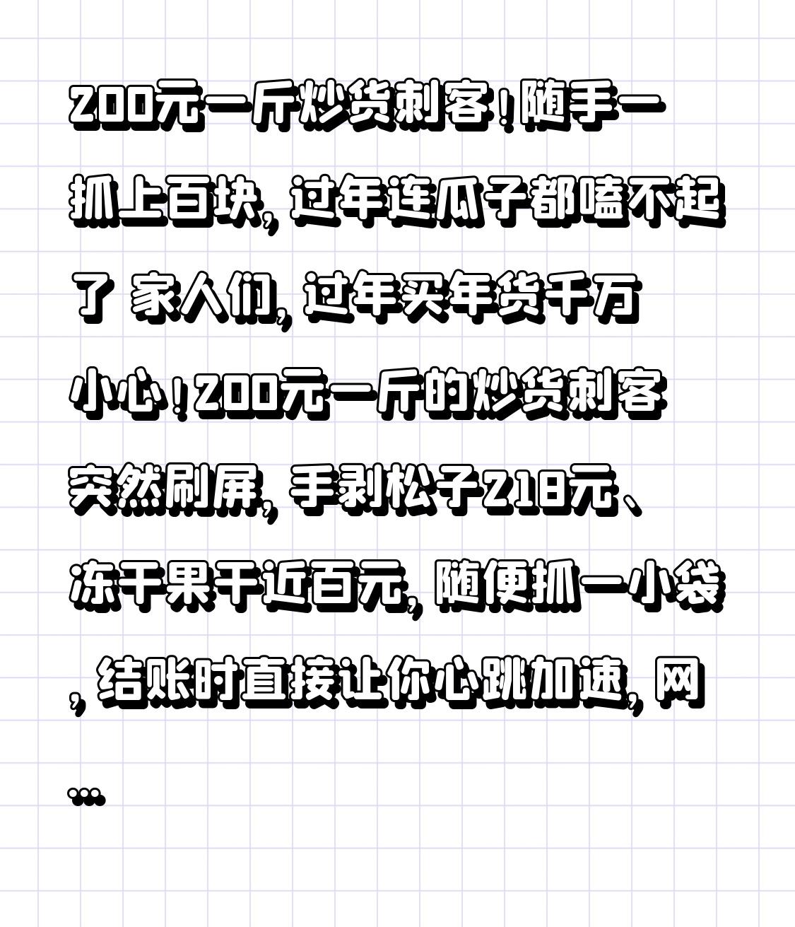 200元一斤炒货刺客!随手一抓上百块,过年连瓜子都嗑不起了 家人们,过年买年货千万小心!200元一斤的炒货刺客突然刷屏,手剥松子218元、冻干果干近百元,随便抓一小袋,结账时直接让你心跳加速,网友直呼:这哪是炒货,简直是“炒黄金”! 曾经十块钱三大袋的瓜子花生,是过年最接地气的快乐。如今商场里的网红炒货店,装修精致、品类花哨,普通瓜子卖到23.8元一斤,开心果、腰果直奔百元,手剥松子更是突破200元大关,一斤能买十几斤猪肉。很多人进店没概念,看着好看随手装,一称就是大几十、上百块,碍于面子只能硬着头皮买单。 大家以为是原料大涨、成本飙升?转折点来了!业内人士爆料,溢价根本不在成本,而在套路。商场高额租金、精致包装、网红营销,全都摊进了零售价;再加上“现烤”“冻干”“轻奢”等概念包装,把几块钱的原料,翻几倍卖给消费者。更有网友实测,3片猪肉脯50元,味道和普通款没差别,纯纯交智商税。 一边是普通人吐槽吃不起,过年连嗑瓜子都要精打细算;一边是门店排长队、销量居高不下。本质上,是商家抓住了年轻人“要面子、重仪式感”的心理,把炒货变成社交货币,让大家为颜值和营销买单,却忽略了零食本该有的性价比。 过年的快乐,从来不是贵价炒货给的。小时候一把瓜子、几颗糖,一家人围坐聊天,就是最浓的年味。如今价格越炒越高,年味却越来越淡,我们真正需要的,是实在的品质、亲民的价格,而不是被套路、被收割。 年货不必追网红,适合自己、家人爱吃才最重要。拒绝炒货刺客,远离溢价套路,把钱花在刀刃上,过一个实在、暖心的幸福年。你被炒货刺客“刺”到过吗?评论区说说你的经历!