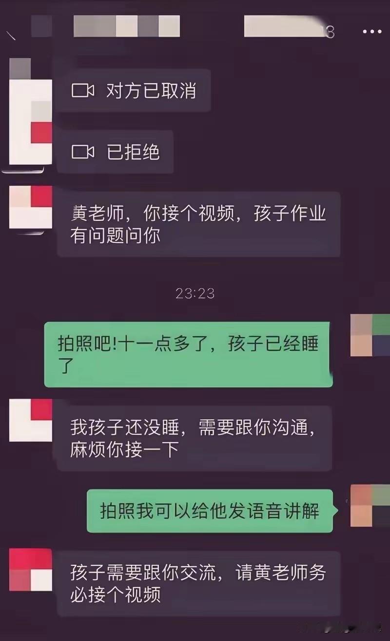 “真被这家长整无语了!”网传一张截图,深夜11点多,家长突然发来消息:“黄老师,接个视频,孩子作业有问题问你。” 此时孩子早已睡下,老师耐心回复:“拍照吧,十一点多了,孩子已经睡了。” 可家长不依不饶:“我孩子还没睡,需要跟你沟通,麻烦你接一下。” 深夜十一点多,本是大多数人洗漱休息、进入睡眠的时间,一位负责日常教学工作的黄老师也结束了一天的忙碌,准备卸下工作状态好好休息。 就在这个时间段,这位老师的社交账号突然收到了来自学生家长的消息提醒,打破了原本安静的夜晚。 家长在消息中直接提出要求,希望老师立刻接通视频通话,理由是孩子的作业出现了问题,需要当面和老师进行沟通解决。 面对家长突如其来的请求,老师并没有直接拒绝,而是保持着耐心的态度进行回复,考虑到深夜的时间已经不适合孩子和老师进行视频交流, 老师建议家长将孩子作业中存在问题的部分拍摄成照片发送过来,这样既可以解决学习上的疑问,也不会打扰到孩子和老师的正常休息。 老师的这一处理方式,兼顾了学生的学习需求和双方的作息时间,是符合常理且人性化的选择。 可这位家长并没有接受老师的合理建议,反而坚持自己的想法,继续向老师提出视频通话的要求,完全没有顾及深夜十一点这个特殊的时间点, 也没有体谅老师忙碌一天后需要休息的状态,更没有考虑到多数孩子在这个时间早已进入睡眠的事实。 家长始终以孩子还未休息、必须立刻沟通作业问题为由,要求老师配合自己的安排,将个人的需求放在了首位,忽略了师生之间合理的沟通边界和基本的作息常识。 这一段聊天记录被传到网络上之后,迅速引发了大量网友的关注和讨论,相关的内容在社交平台上不断被转发,成为了很多人热议的焦点。 网友们针对这件事发表了各自不同的观点,有人讲述了自己作为老师的亲身经历,提到日常教学之外经常遇到非工作时间的不合理要求,长期处于被打扰的状态,身心都承受着不小的压力。 也有身为家长的网友表示,辅导孩子作业确实会遇到难题,但应当分清时间和场合,深夜打扰老师并不是理智的做法,家校之间的沟通需要建立在相互尊重的基础之上。 还有网友认为,老师的工作有明确的时间范围,除了紧急情况之外,非工作时间理应拥有属于自己的私人空间, 家长应当学会合理规划孩子的学习时间,而不是随时要求老师提供帮助。不同身份的网友各抒己见,让家校沟通的边界感、师生之间的相互尊重等话题被更多人关注和思考。 对此,你们有什么看法,欢迎评论留言~