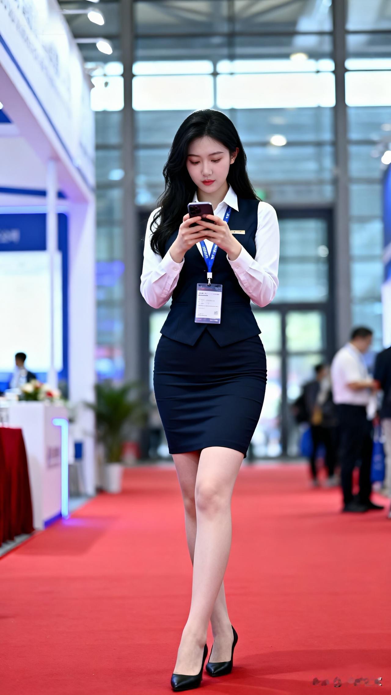 别看我表面光鲜亮丽,然而打工人一天才是真实人生 朋友们,给你们看看我今天的“高光时刻”——正在展会红毯上低头回工作消息呢!(图1图2)是不是以为这种场合都得端着咖啡优雅社交?其实这才是我们打工人的日常。 穿上白衬衫、蓝马甲和短裙(图3),踩上高跟鞋,挂上工作证,整个人就得切换到“战斗模式”。展会里热热闹闹的,周围展位人来人往(图4),但该回的消息一条都不能少。你看我站在红毯正中间,捧着手机认真敲字的模样(图1图2),是不是特别真实? 说实话,展会这地方看着光鲜,对我们工作人员来说就是战场。一边要注意形象,随时准备接待客户;一边手机微信叮叮咚咚响个不停——同事找、客户问、领导催……红毯再长,也得站着把消息回完。 不过说真的,我挺喜欢这种忙碌的充实感。站在明亮的展馆里(图3),看着自己参与布置的展位,虽然这会儿正低头处理事务,但心里知道,每一个这样匆忙的瞬间,都是在往目标前进。 同行们应该都懂这种感觉吧?不管场面多正式,该干的活一点不少。这才是咱们职场人最真实的样子——既能在红毯上从容行走,也能随时停下来处理工作。为每一个在展会上一边奔波一边回消息的自己点个赞!