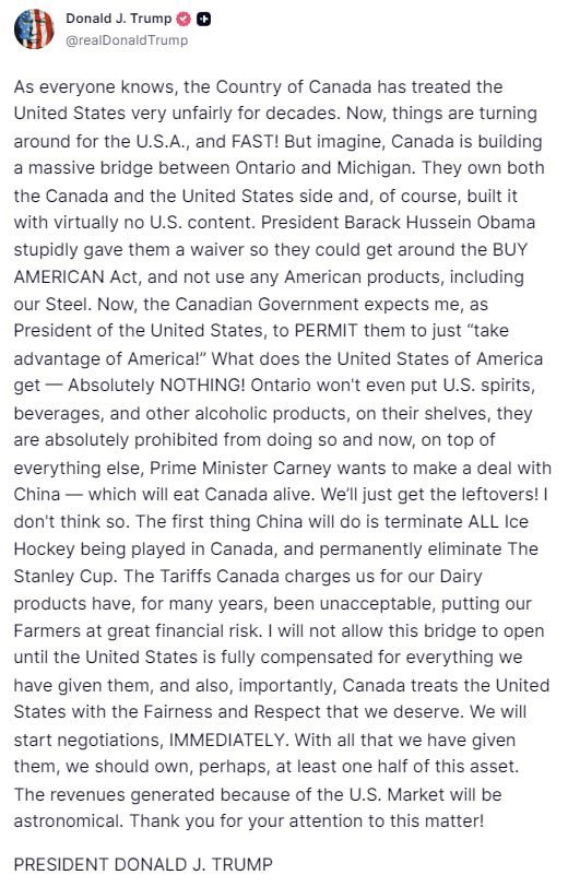 特朗普威胁要阻止美加边境大桥的开放,理由是“加拿大对美国怀有敌意,且正与中国走得越来越近”。这座桥指的是底特律与温莎之间的戈迪-豪国际大桥,计划于2026年初开放。它将是美加两国唯一一座允许行人与自行车通行的大桥。特朗普要求加拿大给予“全面赔偿”,并“公平对待”美国。他还坚持美国至少应拥有该项目一半的所有权。特朗普表示,有关该项目的谈判应立即启动。
