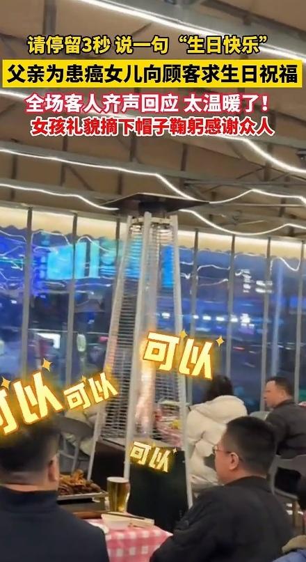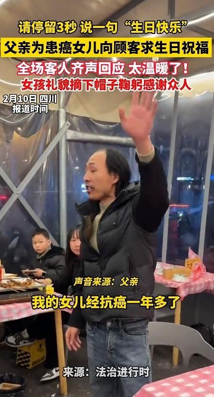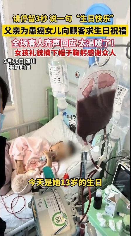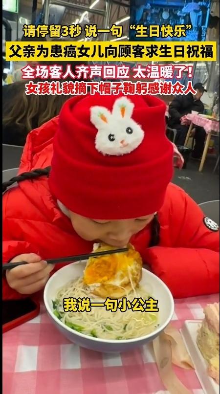 看哭了!2月10日,四川,一对父女走进了一家饭店,今天是个特殊的日子,是他女儿的生日,她的女儿真的太苦了,年纪这么小,就身患癌症。因此,父亲想给女儿过一个难忘的生日。 所以,当这位父亲给女儿点好一碗长寿面之后,这位父亲突然站起身,对着满屋子正在吃饭的客人深深鞠了一躬,声音带着哽咽:“打扰大家一分钟,我的女儿抗癌一年多了,今天是她13岁的生日,我说一句小公主,大家能不能说一句‘生日快乐’?可以吗?” 听到这位父亲这么说,整个饭店瞬间安静了。紧接着,“大家异口同声地说,可以,没问题!” 这位父亲听到后,赶紧向众人表达感谢。 接着,这位父亲就开始对着女儿呼喊小公主,而众人齐声呐喊:“生日快乐!” 女孩本来还在吃长寿面,听到众人祝福她的生日,她赶紧起身,摘下了帽子,对着所有陌生人深深鞠了一躬,小声说:“谢谢大家。” 那一刻,没有陌生人,只有一群素不相识的人,用最朴素的善意,给了一个正在与病魔抗争的孩子,最珍贵的生日礼物。 网友看到后评论说:“我也是个爸爸,看这个视频的时候,眼泪止不住地流。换作是我,我也会放下所有面子,只为给孩子多一份温暖。这些陌生人,真的太暖了。” 还有的网友说:“这个世界虽然不完美,但总有一些人,用自己的方式,偷偷地爱着这个世界。愿我们都能成为那个愿意伸出手的人,也愿我们在需要的时候,也能被这个世界温柔以待。” 我们总说,成年人的世界很残酷,人心很冷漠。可在这个小小的饭店里,我看到了人性最柔软、最温暖的一面。 这位父亲,明明自己承受着巨大的痛苦和压力,却依然想给女儿一个被全世界祝福的生日。他放下了所谓的“面子”,用最卑微的方式,为女儿求一份温暖。 而那些陌生人,没有丝毫的犹豫和嫌弃。他们放下了手中的筷子,停下了交谈,用一句简单的“生日快乐”,给了这个家庭最坚实的支撑。 我们不知道这个13岁的女孩,在过去的一年里经历了多少化疗的痛苦,也不知道她的父母熬过了多少个无眠的夜晚。 但是,我们知道,在女孩的这个生日,她被整个世界温柔以待。 最后,希望这个小公主,生日快乐,早日打败小怪兽,尽早恢复健康,加油!