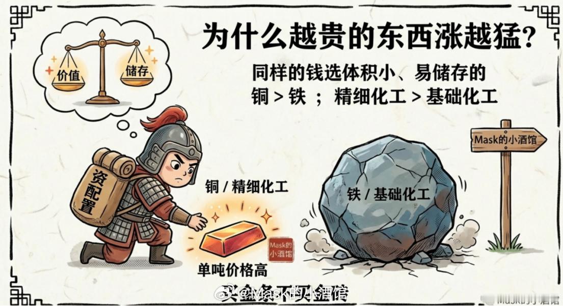 为什么?因为这不是产业需求推动的,而是资产配置在转移。说白了,当投资者配置大宗商品的时候,同样的钱,他们会选体积更小、更方便储存的品种。铜比铁值钱,所以铜涨得比铁快。化工品里,精细化工比基础化工更受青睐。就像买黄金,大家都买金条不买金砖,因为金条好存、好运、好交易。