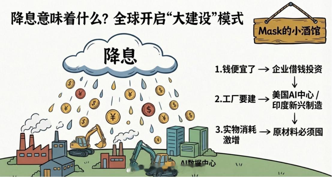 为什么资金突然要从金融资产转向实物资产?答案很简单——全球进入降息周期,大通胀要来了。降息意味着什么?意味着钱便宜了,企业愿意借钱投资了,工厂要建、设备要买、原材料要囤。美国的AI数据中心还在疯狂扩张,印度、墨西哥、非洲这些新兴市场的制造业也在加速建设。只要还在建东西,那实物消耗就会激增。