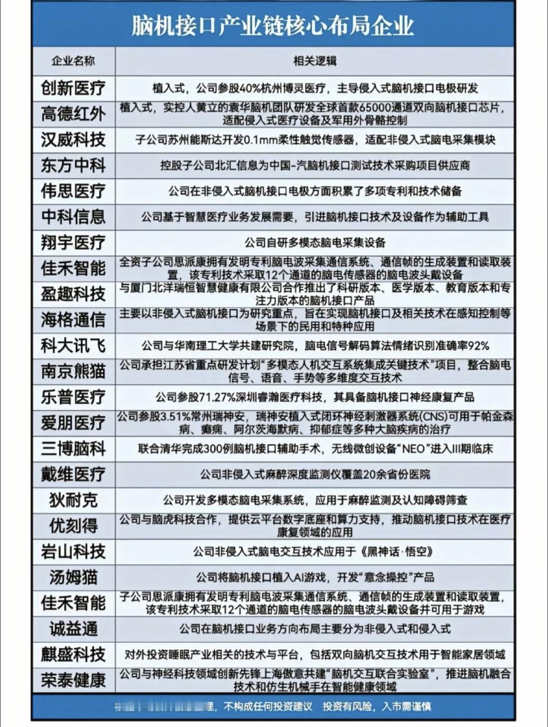 脑机接口:中央定调的未来产业核心赛道! 2月10日中央政治局第二十四次集体学习,将脑机接口明确列为十五五六大未来产业主攻方向之一,定位为颠覆性、战略性前沿技术,行业迎来国家级战略级催化。相关概念龙头企业有哪些? 脑机接口行业处于政策+技术双驱动的早期爆发阶段,国内市场规模预计到2030年有望突破百亿元,全球市场同步高增,年均增速超17%,医疗康复、科研与前沿应用为核心落地场景,长期成长空间明确。 脑机接口概念龙头代表:上游看汉威/高德,中游看讯飞/世纪华通,下游看三博/乐普;全球看Neuralink,国内未上市看强脑/脑虎。 信息仅供参考,不构成投资建议。行业尚处早期,技术迭代、临床验证、商业化进度存在不确定性,投资需谨慎。