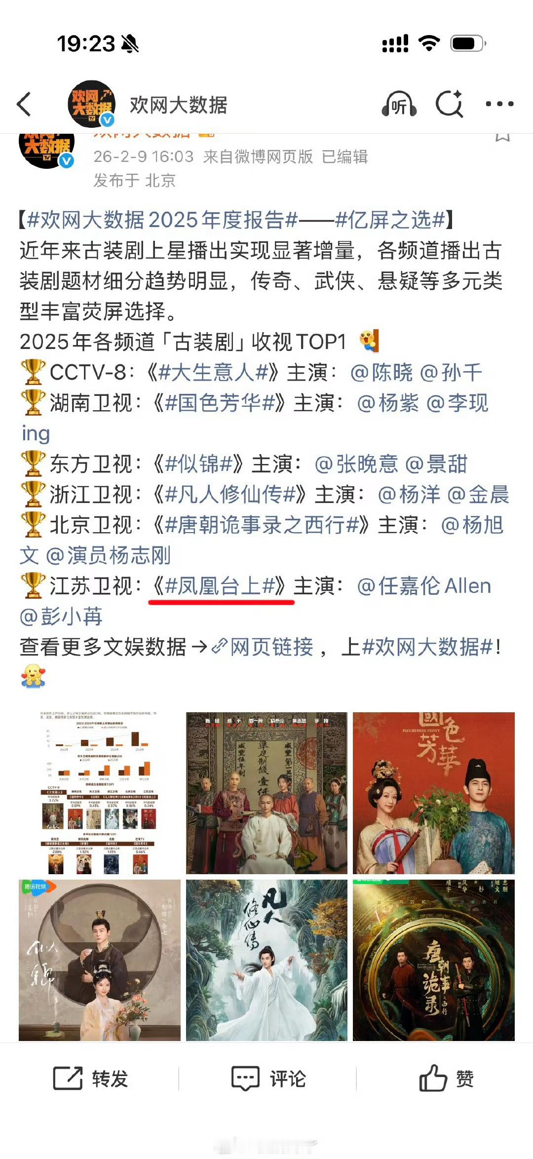 《凤凰台上》拿下2025年江苏卫视「古装剧」收视TOP1 1️⃣🐮🐮 凤凰台上有自己的节奏哈哈哈哈哈哈哈 放养的剧也能获得江卫的古装年冠,真牛任嘉伦饰演的萧焕一角,凭借高达52%的角色贡献度峰值,成为剧集热度的核心引擎,再次验证了其作为头部演员在市场端的稳固号召力