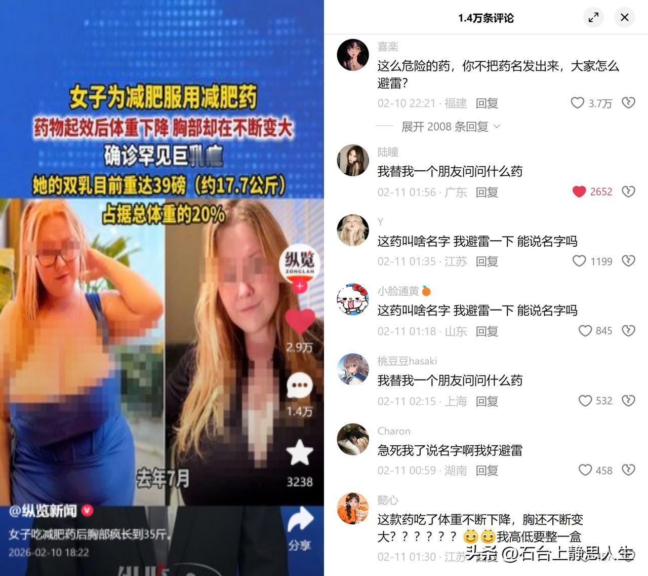瘦60多斤,胸长到35斤! 英格兰女子蒂安娜为减肥吃了款减肥药,整整瘦了60多斤,结果胸部疯长到35斤,占体重的20%,还确诊了罕见巨乳症。 最绝的是大家上演的反向种草大戏:所有人嘴上喊着快说药名我好避雷,转头就暴露真实想法,我替朋友问、我吃少点不贪、高低整一盒。 合着这哪是避坑?简直是打着避雷的幌子,疯狂求药! 这不就是人性里的贪婪在作祟吗?既要躺着快速甩肉不费劲,又想保住甚至升级所谓的女性身体优势,哪怕知道有风险,也觉得我肯定是那个幸运儿,不会中招。 减肥药的副作用本来就摆在那,可一听到瘦而胸大这种完美设定,所有人都选择性失明了。天底下哪有不劳而获的好事?真能鱼和熊掌兼得,轮得到咱们在这看热闹?