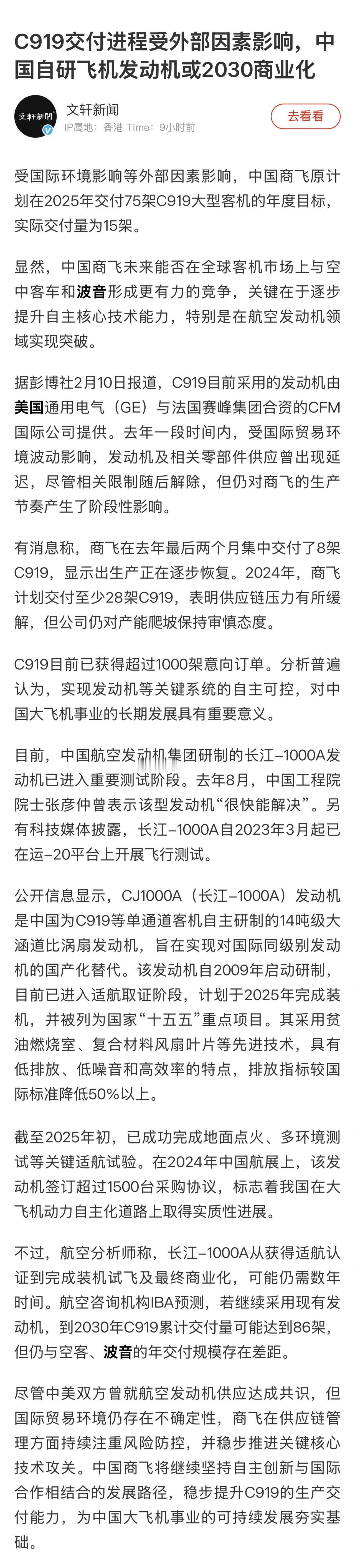 航空专家分析认为,长江-1000A取得中国民航的适航证可能耗时两年。随后,获批系统还需安装在C919上进行测试和审查,可能再耗时两年,意味着长江-1000A最早也要到2030年才能实现商业化。