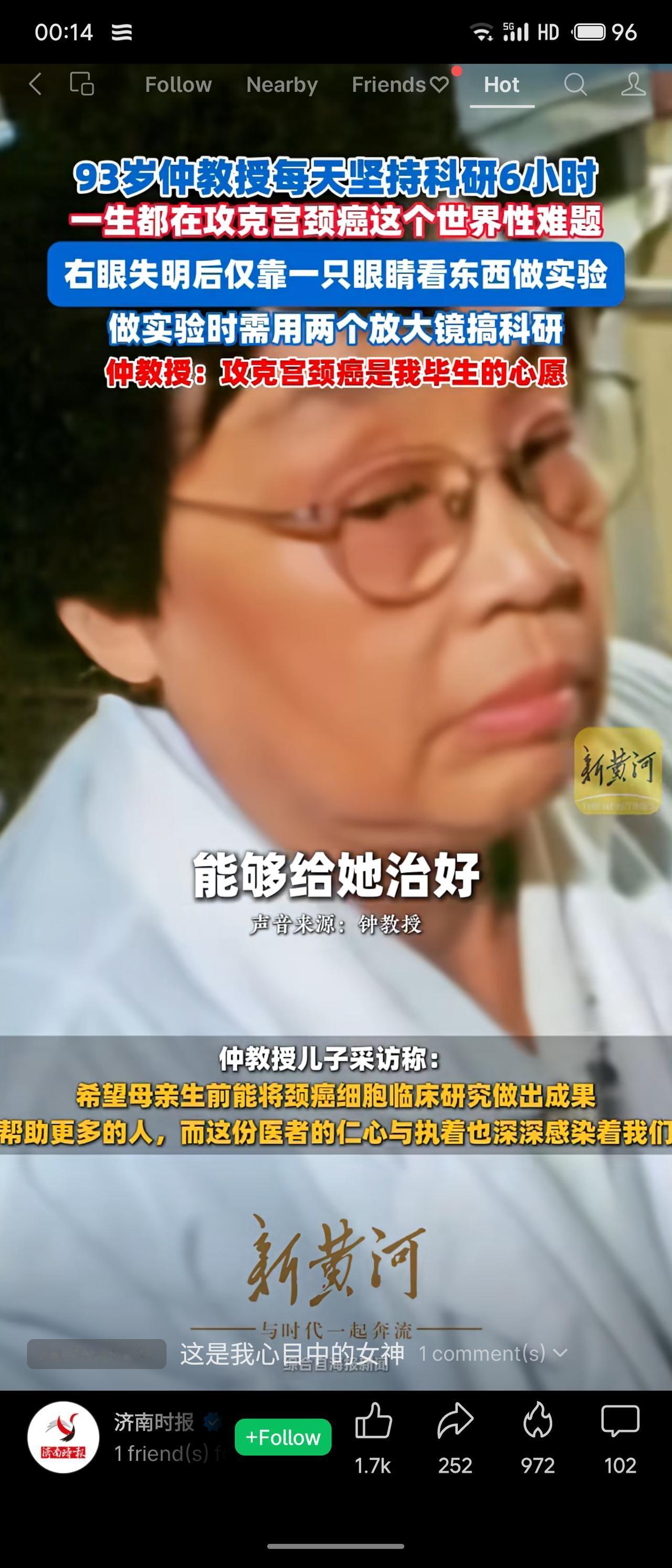93岁的仲发明教授每天坚持科研6小时,矢志攻克宫颈癌。即便右眼失明,她仍借助放大镜坚持实验。作为微生物免疫学泰斗,她曾获“全球免疫学家”殊荣,其医者仁心与执着令人感佩。