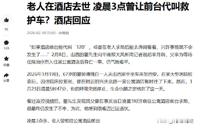 陕西西安,一位六旬老人远赴此地看病,心疼远嫁女儿,不愿添麻烦,便独自住在廉价酒店。某天凌晨,老人突发不适前往酒店前台求助,希望工作人员帮忙拨打120,可工作人员却以不会为由拒绝,让老人自己联系家属。老人无奈返回房间,没想到这一去竟再也没能出来。儿女得知此事后,对酒店前台的冷漠做法心寒不已。 华商报、大风新闻报道了这则新闻。 六旬老人从山西老家到西安看病,她的女儿嫁到了西安,但他怕给远嫁到这边的女儿添麻烦,就没吱声,独自在外面住40一晚的酒店。 儿女一直都不知道老人来了西安,老人想着自己能扛就扛,他每早上去就医,晚上就回到那间小酒店休息。 这天凌晨,老人突然感觉身体特别难受,他强撑着起身,想去前台寻求帮助,他脚步踉跄地走到前台,对工作人员说,自己身体不舒服,麻烦帮忙拨打120。 可工作人员的回应让老人心都凉了,工作人员说让老人自己通知家属。 老人听完沉默了,他心里明白,自己远嫁的女儿可能一时半会也赶不过来,而且他也不想打扰女儿。 老人拖着沉重的步伐,重新回到房间,他坐在床边,身体的不适越来越严重,他想再坚持一下,也许过一会就好了。可命运就是这么残酷,回房后不久,老人突发疾病,再也没能出来。 直到第二天,酒店工作人员发现老人一直没出门,感觉不对劲,打开房门才发现老人已经没了气。 他们赶紧报了警,民警通过调查联系上了老人的儿女。 儿女们得知消息后,他们被前台的做法寒透了心,觉得酒店没有尽到应有的救助义务。 酒店认为,自己只是提供住宿服务,没有义务帮客人拨打120。而且工作人员可能也是因为紧张,不知道该怎么处理,才让老人自己通知家属。 酒店与老人之间形成了服务合同关系,酒店有义务为入住客人提供安全保障服务。 依据民法典第一千一百九十八条规定,宾馆等经营场所、公共场所的经营者、管理者,未尽到安全保障义务,造成他人损害的,应当承担侵权责任。 老人凌晨突发不适向前台求助,要求帮忙拨打120,这是基于自身紧急情况向酒店寻求合理帮助,酒店工作人员却以不会为由拒绝,让老人自己通知家属,这显然没有尽到安全保障义务。 老人回房后突发疾病离世,酒店的行为与老人的死亡结果之间存在一定因果关系。 酒店方或许会辩解自己没有专业医疗救助能力,但拨打120是基本且合理的救助措施,并非超出其能力范围。 如果酒店证明自己有应急处理机制,只是工作人员临时失误,酒店还需要承担全部责任吗? 根据法律规定,酒店有责任确保应急处理机制的有效运行和工作人员的正确执行。 就算有机制,工作人员失误导致客人损害,酒店仍要承担责任,只是可能根据具体情况减轻部分责任。 老人自身有疾病,这是否会影响酒店的责任承担? 老人自身疾病是导致离世的一个因素,但酒店未尽安全保障义务也是重要原因。 法院会综合考虑双方因素,确定酒店的责任比例,不会因为老人有疾病就完全免除酒店责任。 大家觉得是不是这样呢,一起来讨论一下吧!