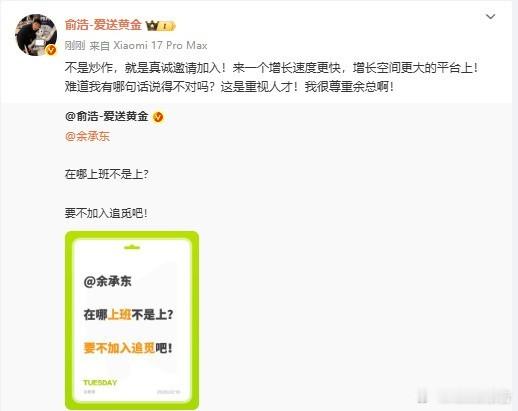 追觅CEO回应喊余承东加入不怕想不到就怕做不到!2月10日,追觅CEO俞浩公开喊话余承东加盟,并称并非炒作,是真诚邀请其加入高增长平台。