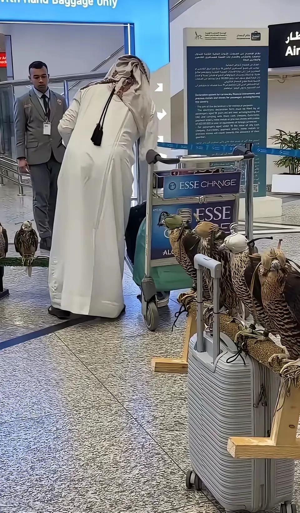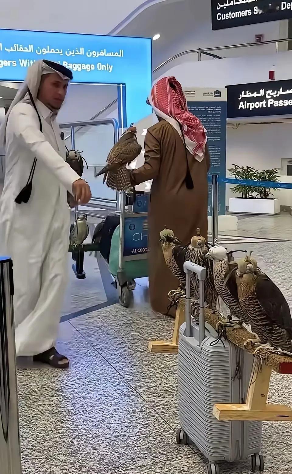 谁懂啊!迪拜机场这一幕,直接把我看呆了! 在迪拜偶遇两位土豪,随身带着10只海东青,每一只都是身价不菲的猛禽,10只总价接近半个亿,堪称行走的顶级财富。 更让人意外的是,海东青是少数能合法进入客舱的动物,主人还给每一只都单独买了座位,待遇比人都好。普通人登机带行李,人家登机带“空中奢侈品”,这差距真的太直观了。