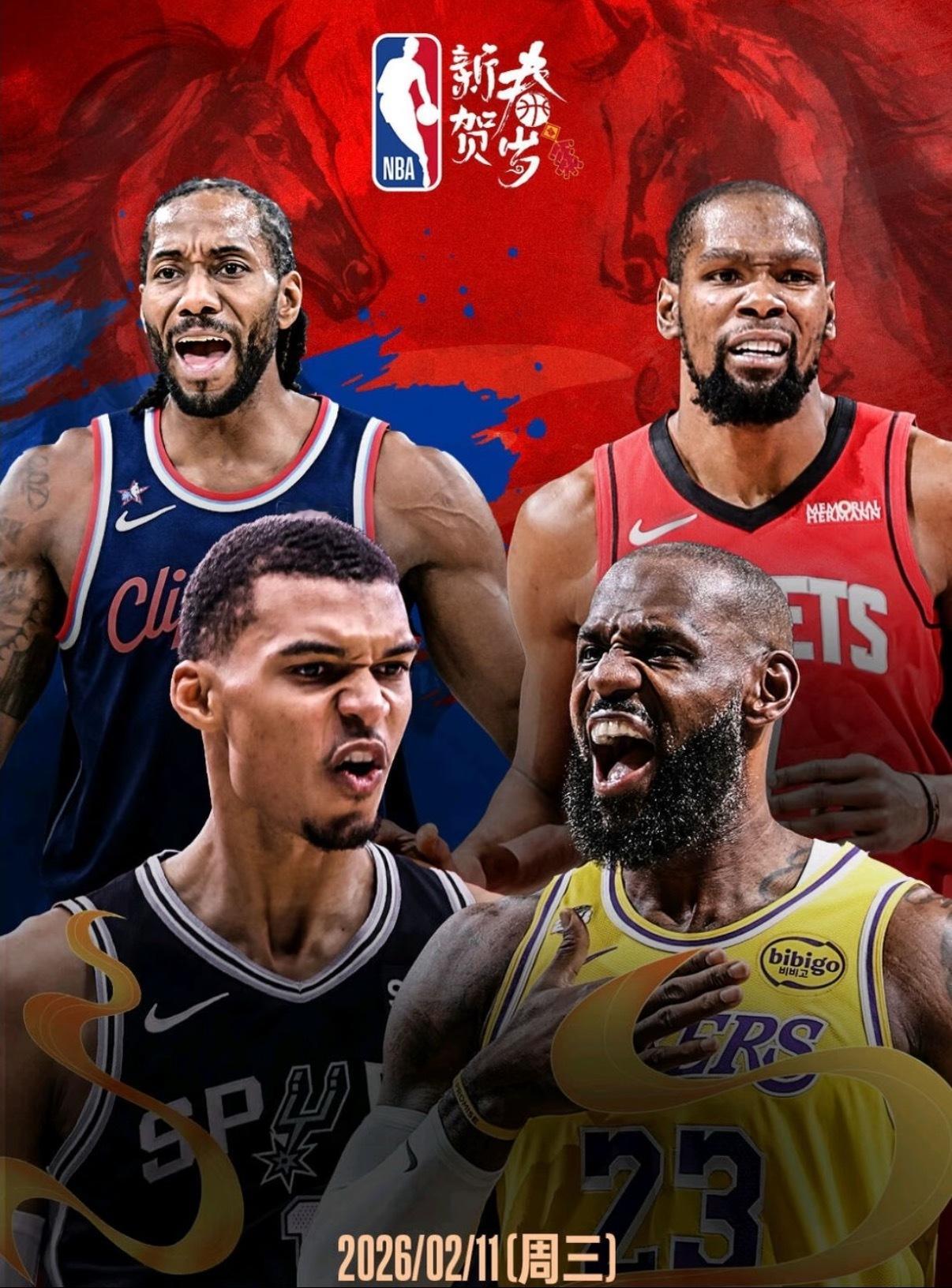 今天两场新春贺岁赛:9点,快船vs火箭;11点半,马刺vs湖人NBA