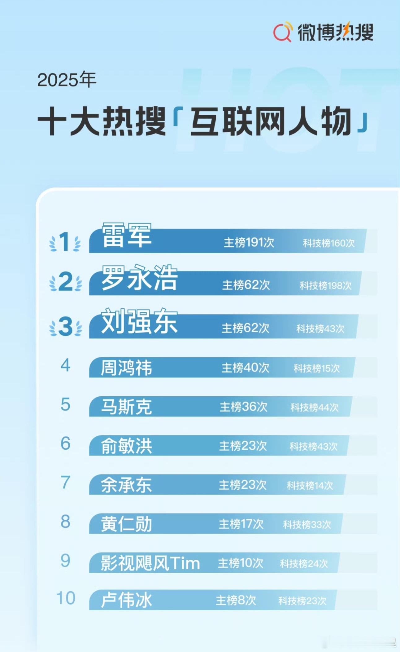 1、雷军2、罗永浩3、刘强东4、周鸿祎5、马斯克6、俞敏洪7、余承东8、黄仁勋9、影视飓风Tim10、卢伟冰