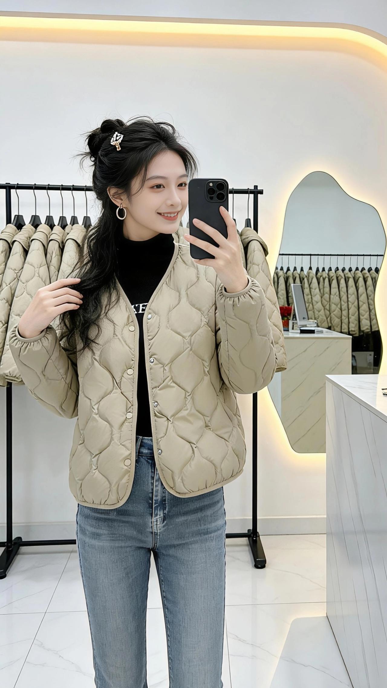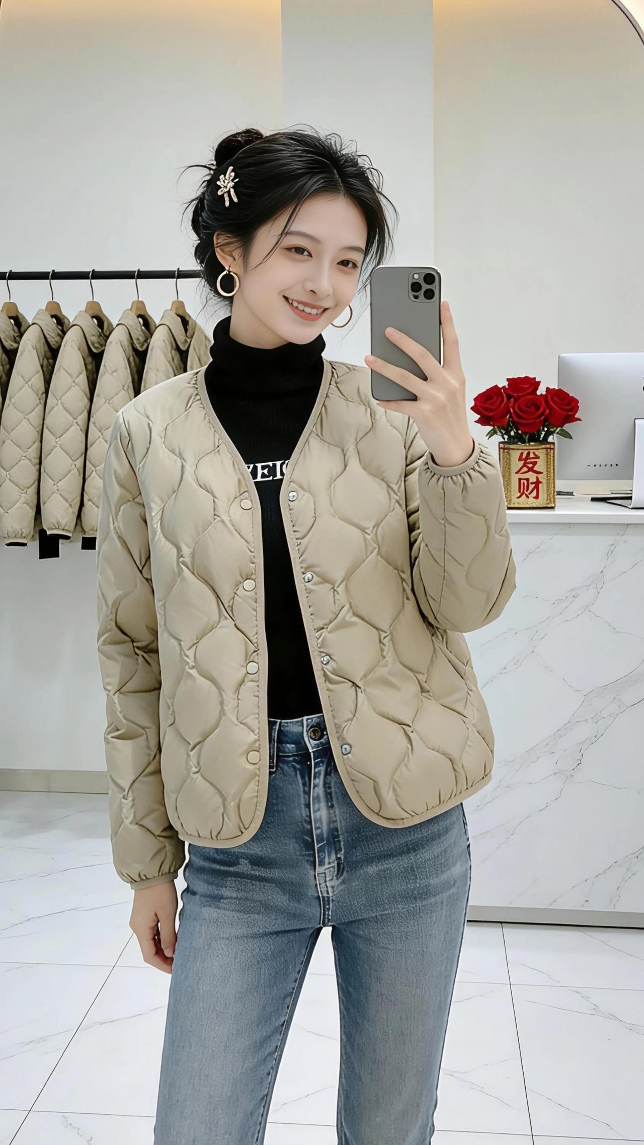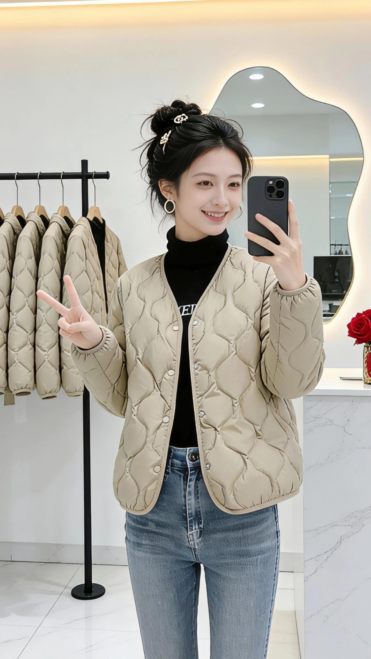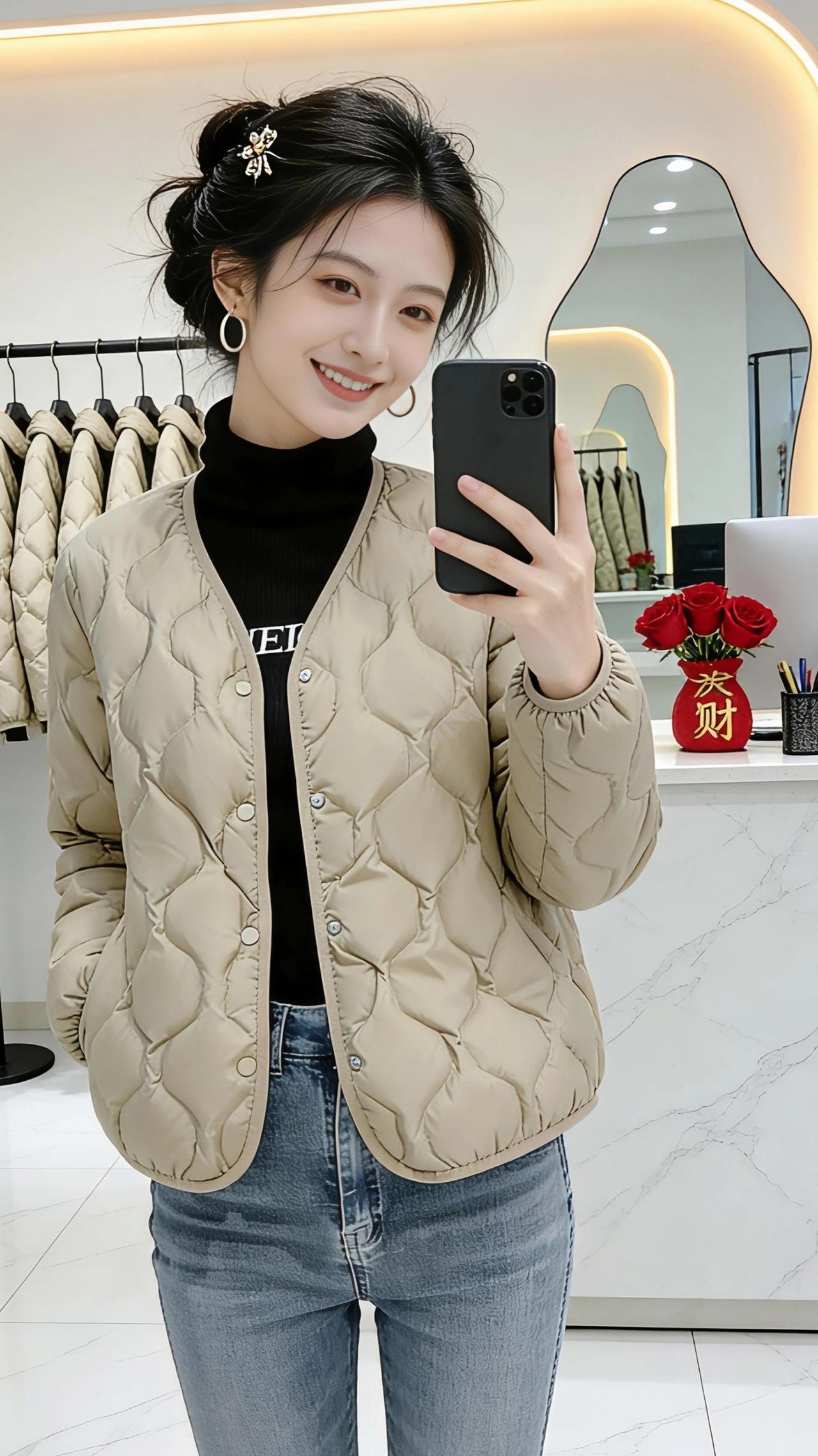镜前的光,是属于自己的温柔。 她站在不规则的镜子前,手机轻举,笑意漫过眼角。浅卡其色的羽绒衣裹着她,像一片被阳光晒软的云,绗缝的纹路是温柔的肌理,每一道都藏着冬日的暖意。黑色高领衫衬得脖颈修长,牛仔裤勾勒出利落的线条,整个人松弛又明亮。 身后的衣架上,同款的浅卡其静静垂落,像一整排未拆封的期待。大理石台面上,红玫瑰与“发财”摆件相映,暖光从镜边漫出,把整个空间烘得柔软又明亮。她时而将手插进衣兜,时而轻撩鬓边碎发,侧身时衣摆轻晃,像风拂过麦田,带着松弛的暖意。 这不是刻意的摆拍,是日常里最动人的片刻——一件暖衣,一面镜子,一个被自己温柔取悦的瞬间。在这个小小的空间里,她把冬日的凛冽,穿成了掌心的温度,把平凡的日子,过成了自带光芒的诗行。 高级感穿搭 新年穿搭 冬季穿搭 小个子穿搭